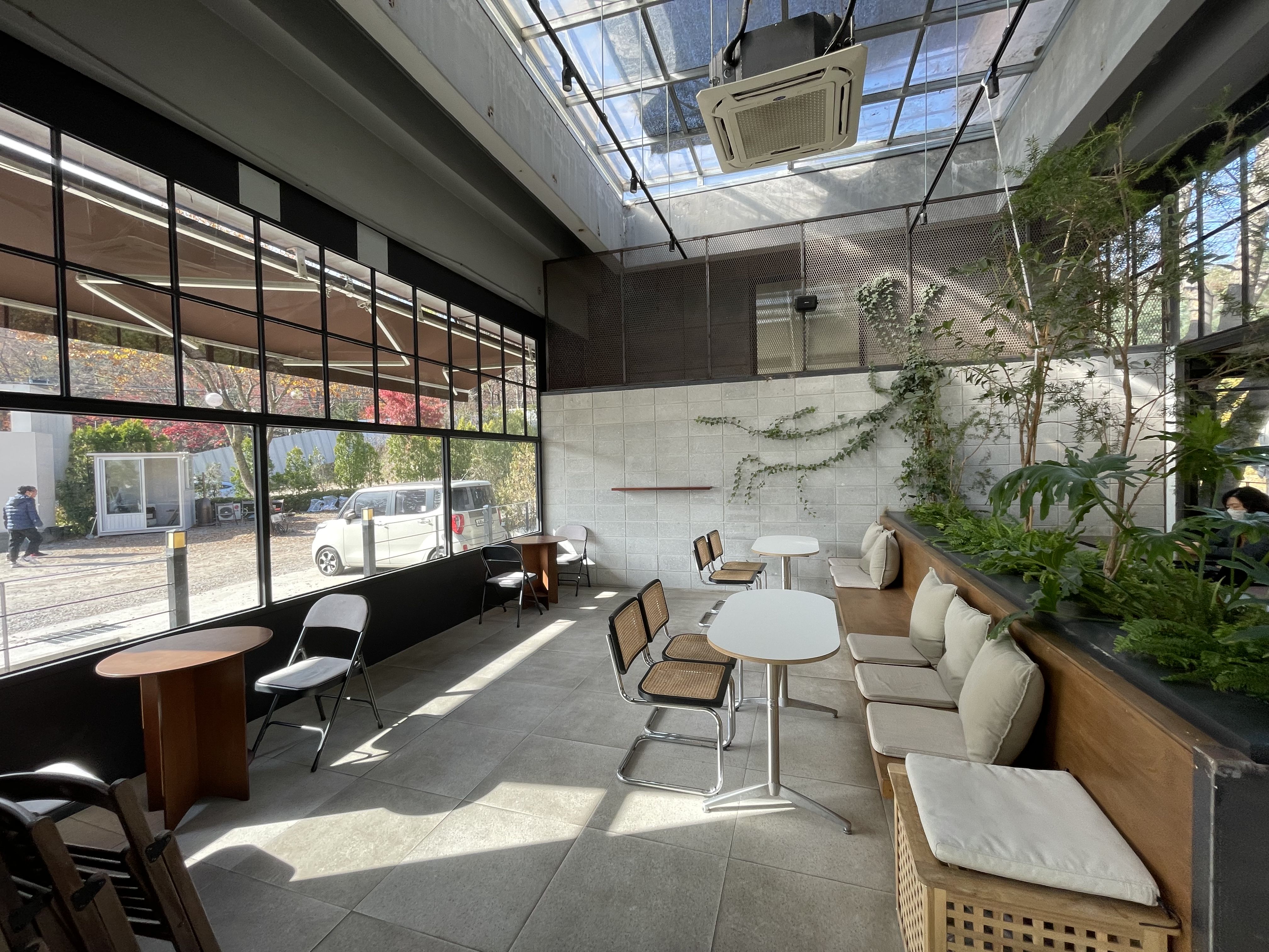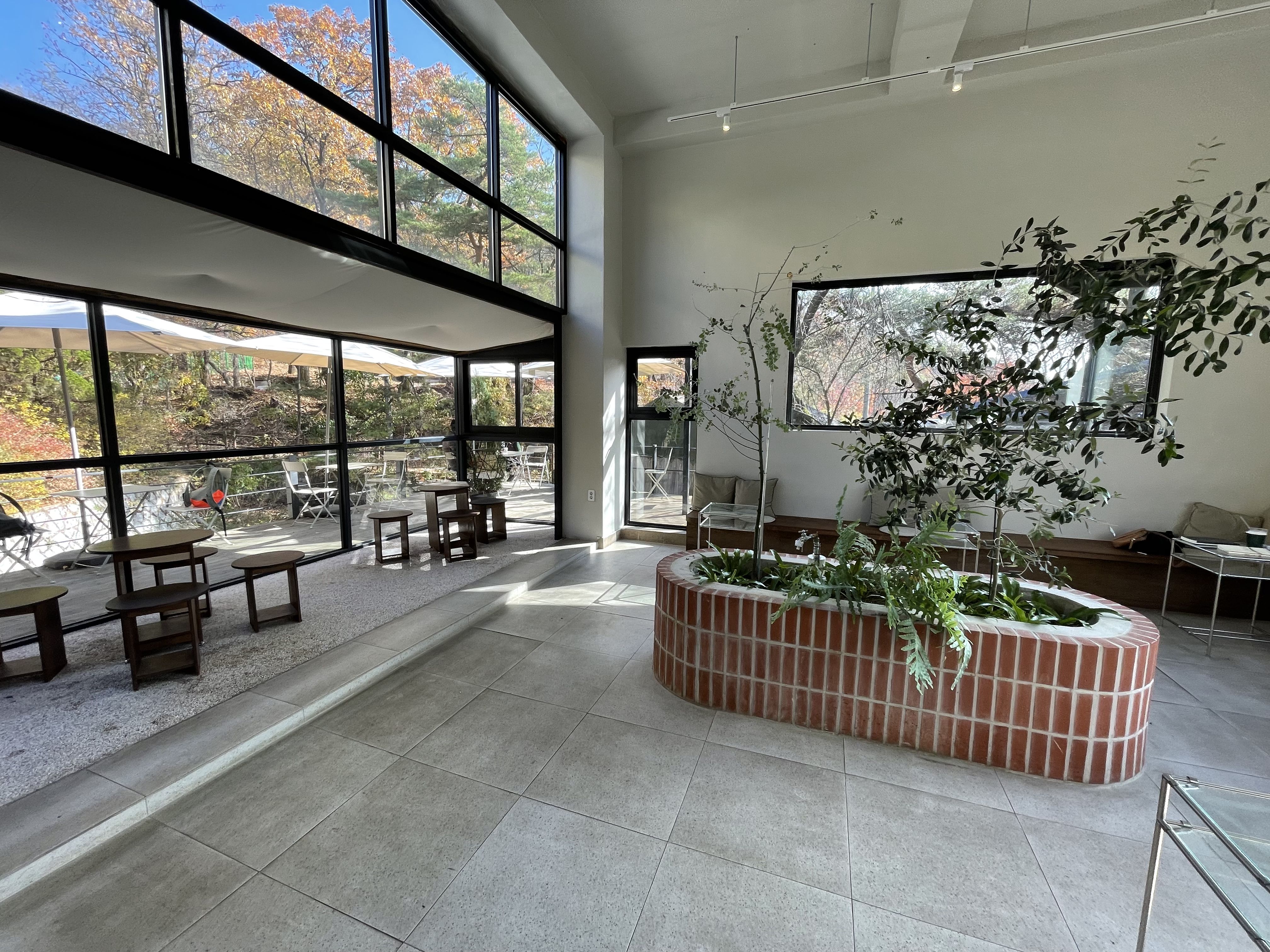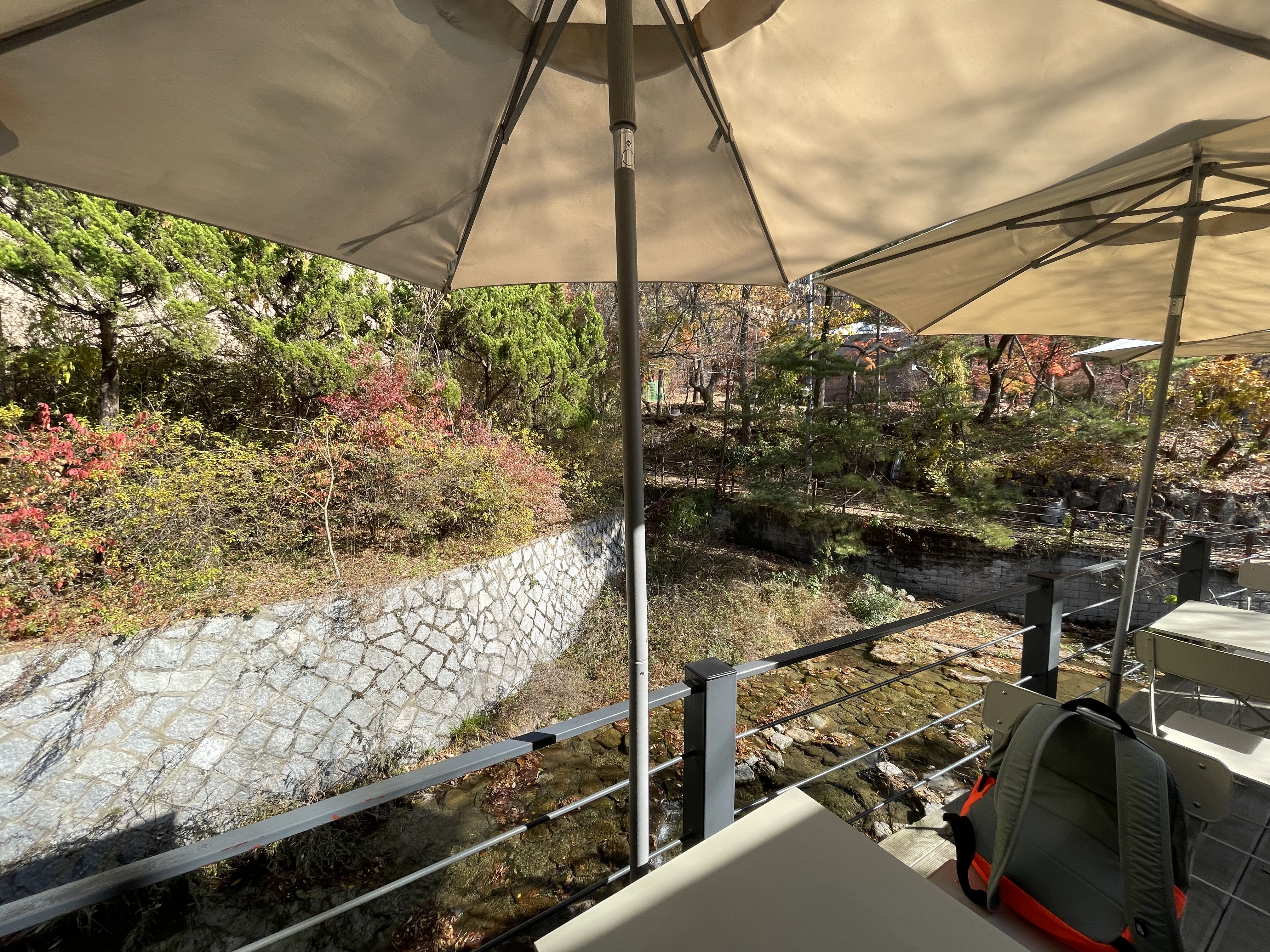 그리고 카페 천장과 벽에 큰 통창이 나 있었는데요, 천장으로는 햇빛이 내리쬐어서 따뜻한 분위기를 느낄 수 있었고, 벽 쪽 통창으로는 단풍이 물든 숲과 계곡물이 졸졸 흐르는 모습을 볼 수 있었어요.