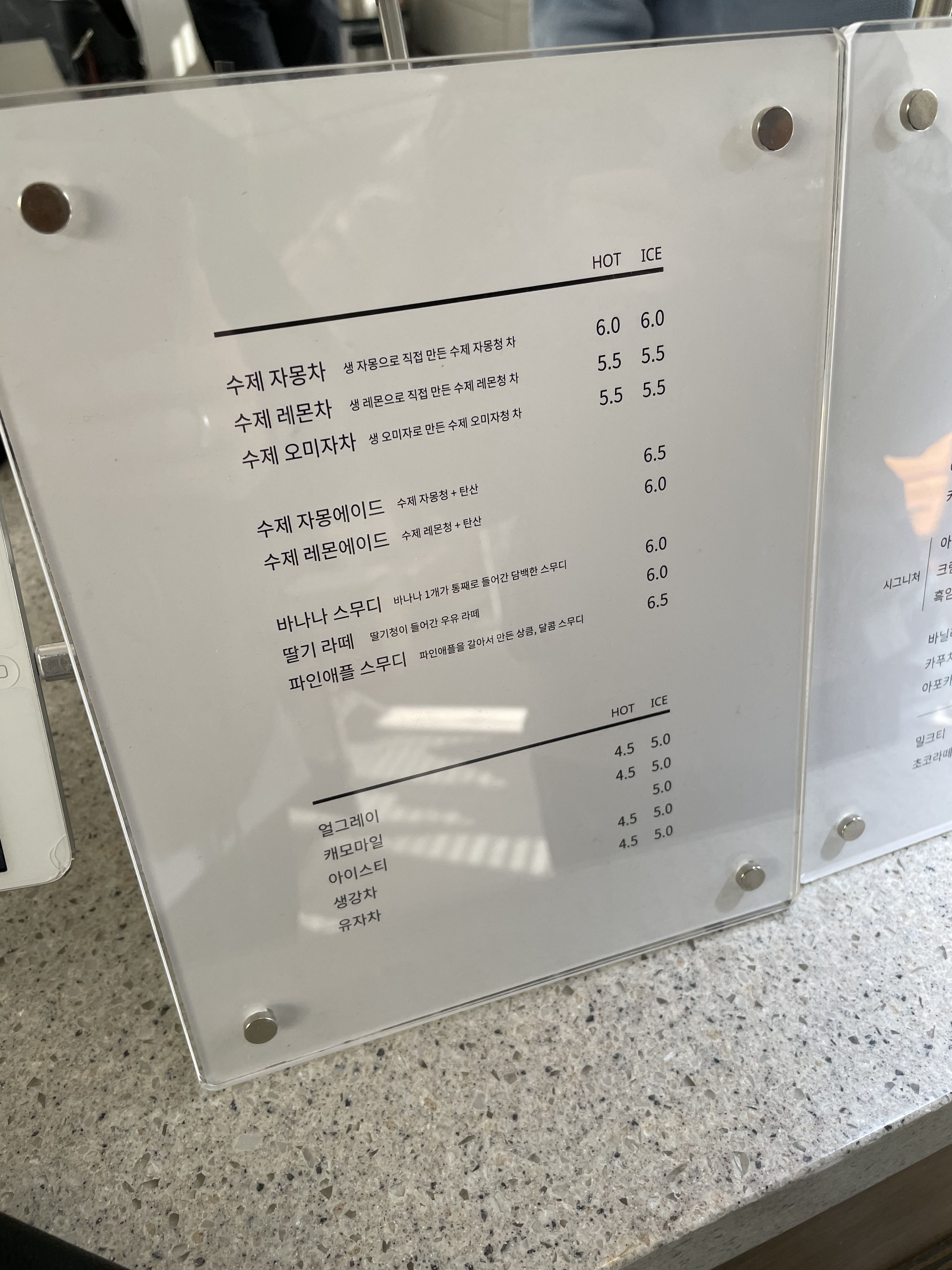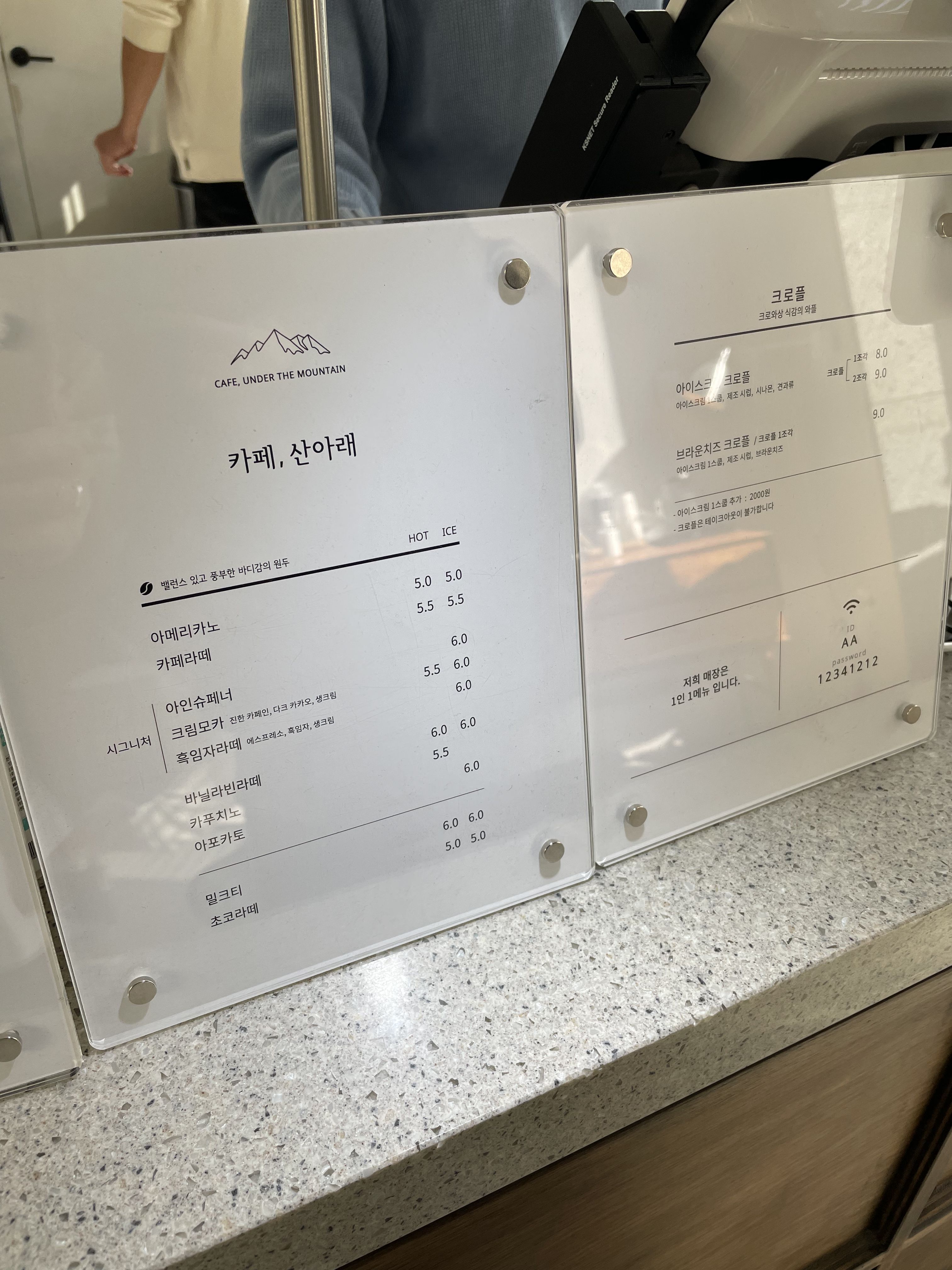카페, 산아래의 메뉴인데요, 여기가 크로플이 맛있는 카페라고 해서 아이스크림 크로플 한 조각과 캐모마일 그리고 아메리카노를 주문했어요.