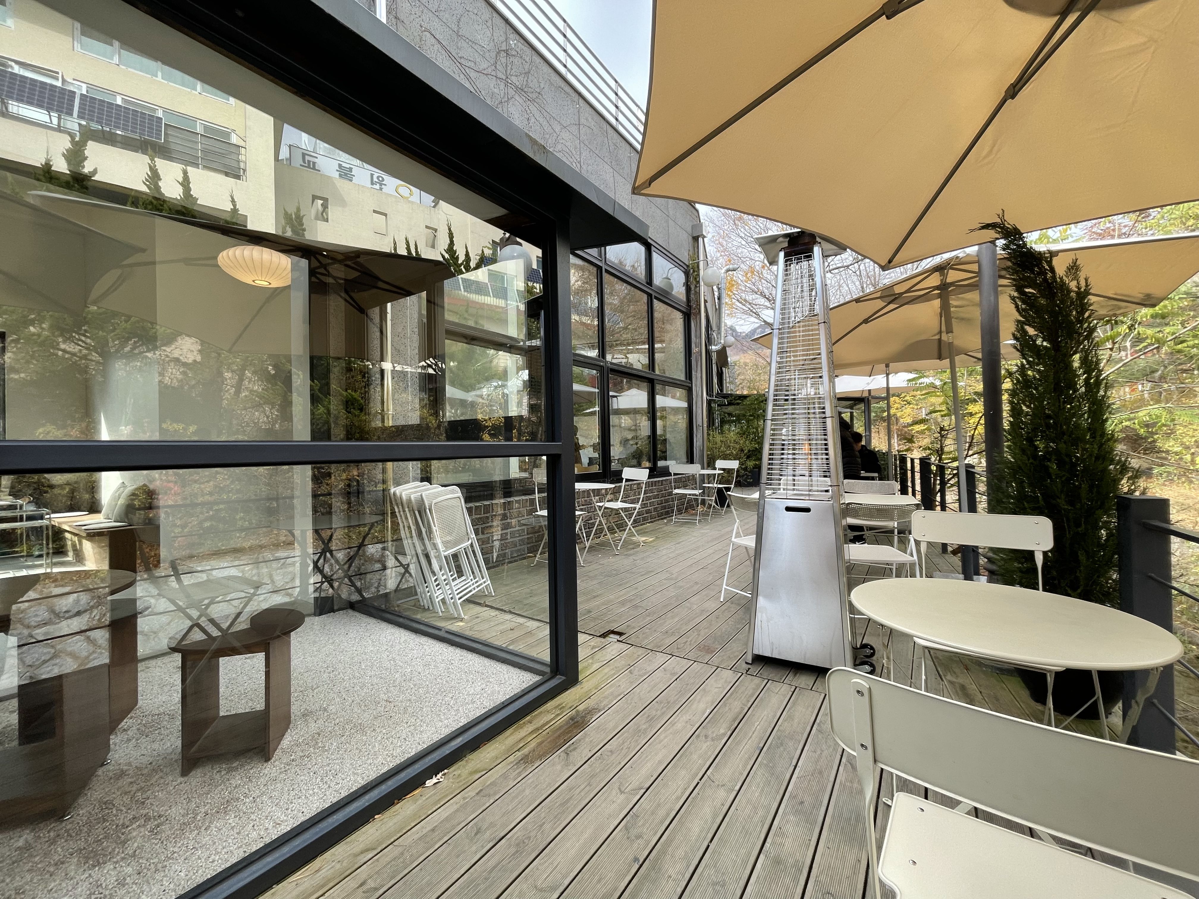 카페 내부도 좋았지만 날씨가 너무 포근하고 좋아서 야외 테이블로 자리를 잡았어요. 테라스 곳곳에 난로가 설치되어 있어서 그렇게 많이 춥지는 않더라고요.