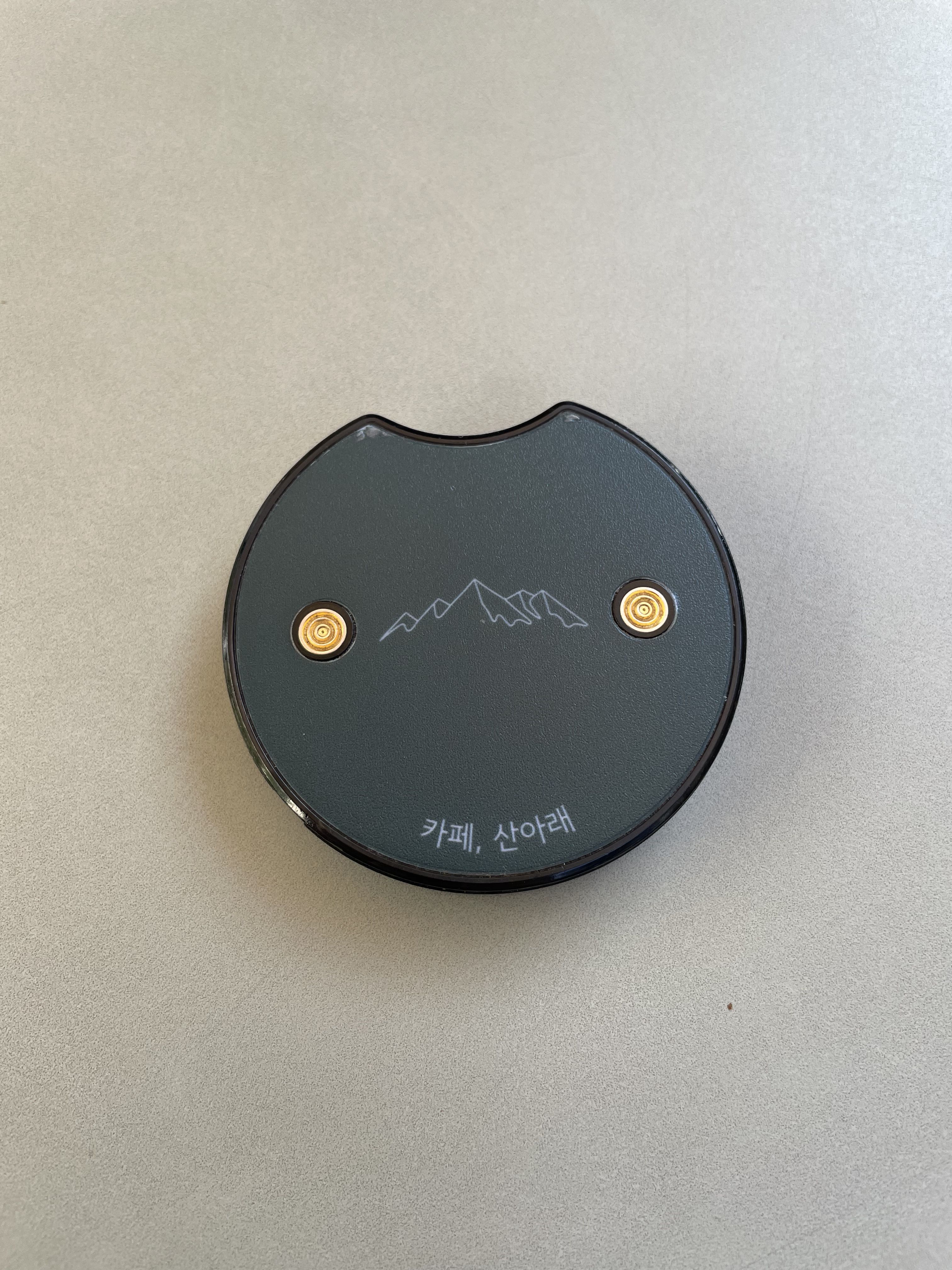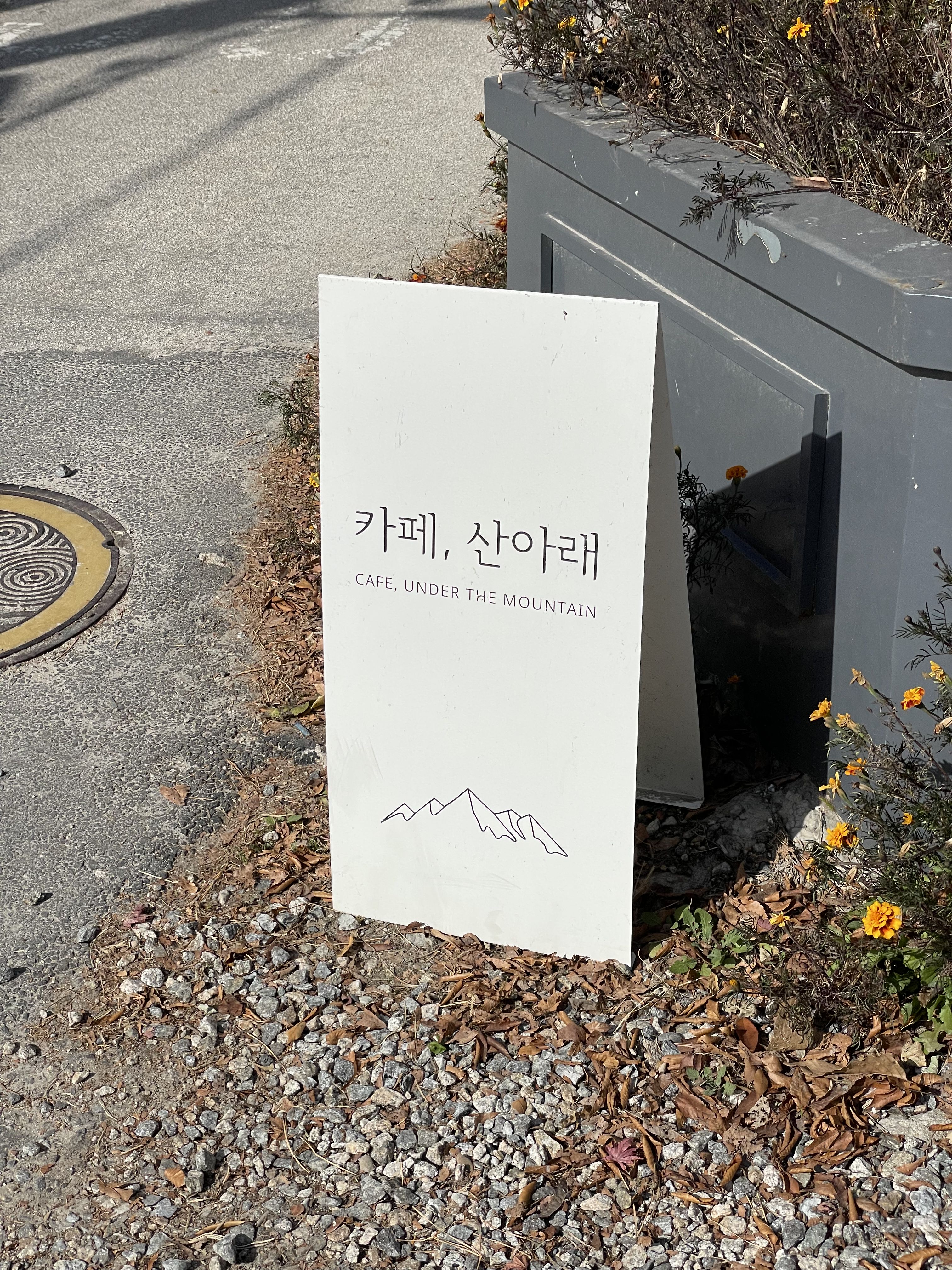카페, 산아래는 1층 단독 건물을 사용하고 있었는데요, 건물 앞 공터가 꽤 넓어서 주차 공간 확보에는 문제가 없어 보였어요. 카페 이름처럼 로고도 산 모양으로 표현되어 있었습니다.