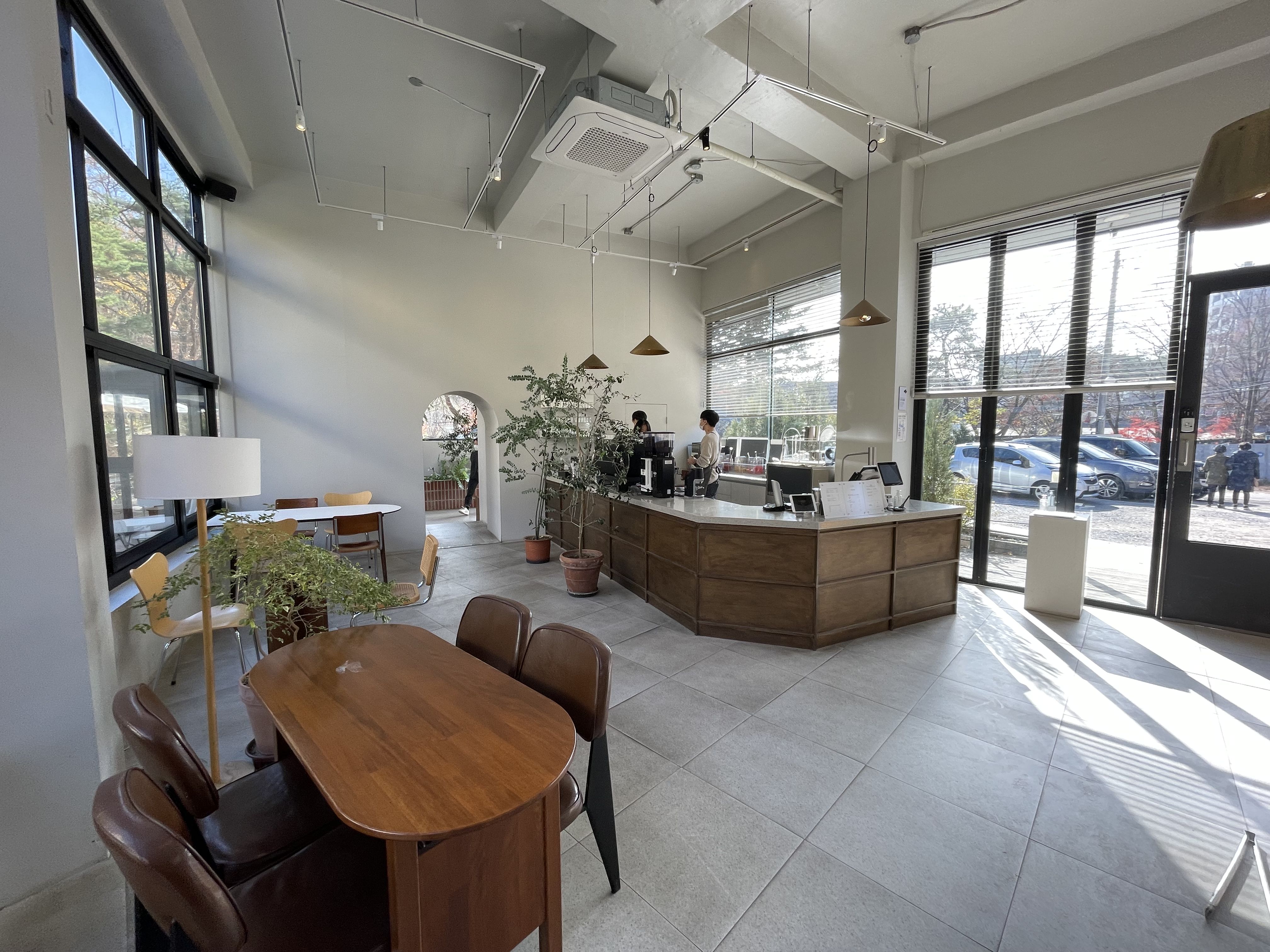 카페, 산아래의 내부 모습인데요, 건물의 층고가 높아서 공간이 답답하지 않았어요. 미드 센츄리 인테리어를 베이스로 카페 곳곳에 식물을 배치해 좀 더 친밀감 있게 자연을 느낄 수 있는 분위기로 연출되어 있었습니다.