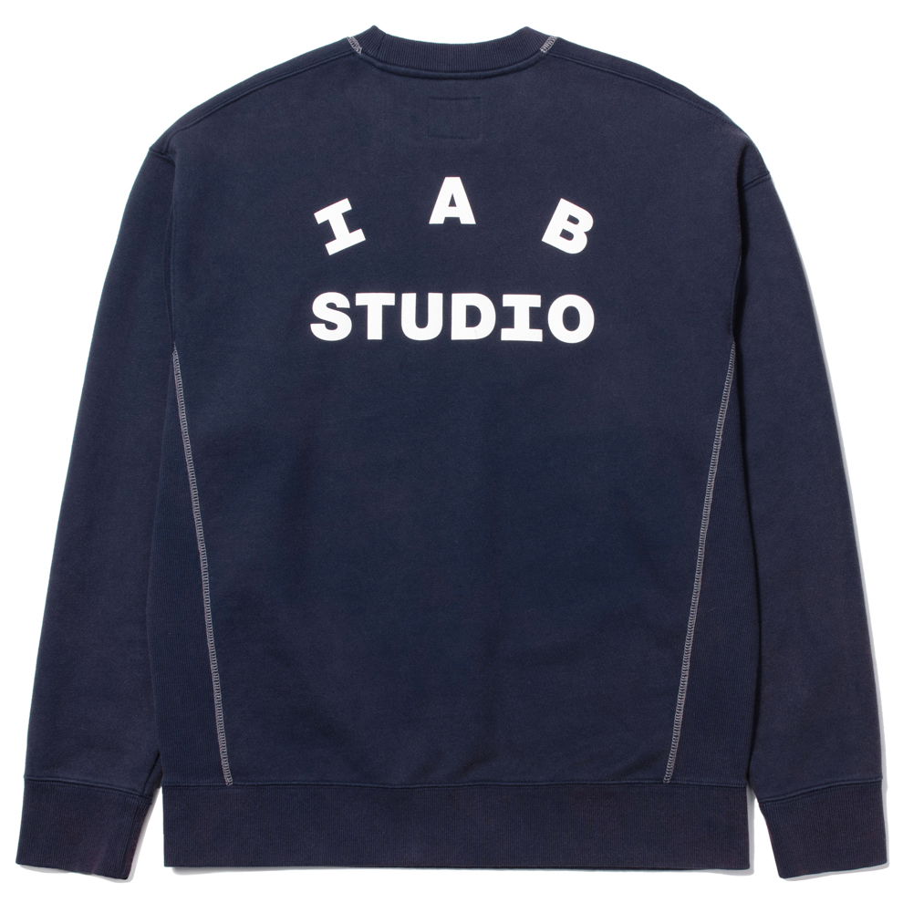 마지막으로 아이앱스튜디오 X 리(Lee) 피그먼트 스웨트셔츠 인디고 제품의 디테일을 살펴볼게요. 처음에 말씀해드렸던 전면부의 로고와 스티치 디테일을 확인할 수 있고요, 뒷면은 아이앱스튜디오의 시그니처 로고 디테일이 커다랗게 들어간 모습을 볼 수 있어요.