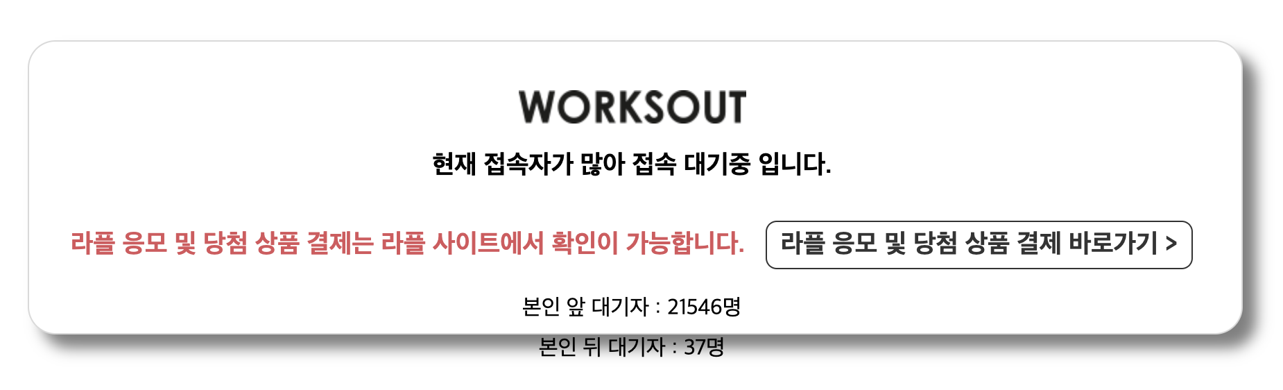 참고로 웍스아웃에서 진행하는 모든 라플 당첨 제품은 만약 구매를 진행하지 않게 되면 추후 진행되는 모든 라플 응모에서 제외돼요. 그래서 웬만하면 구매를 진행하는 걸 추천해드립니다.