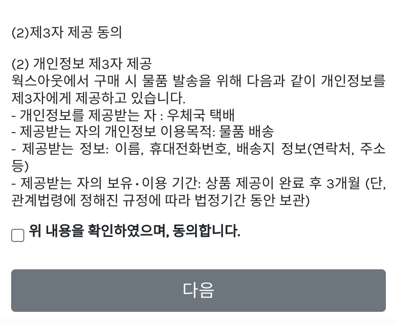 주문서 작성이 끝나면 최종적으로 본인이 주문하려고 하는 제품의 정보가 나오게 되고, 주문과 관련된 2가지 정보에 동의 체크를 하고 '다음'으로 넘어가면 됩니다.