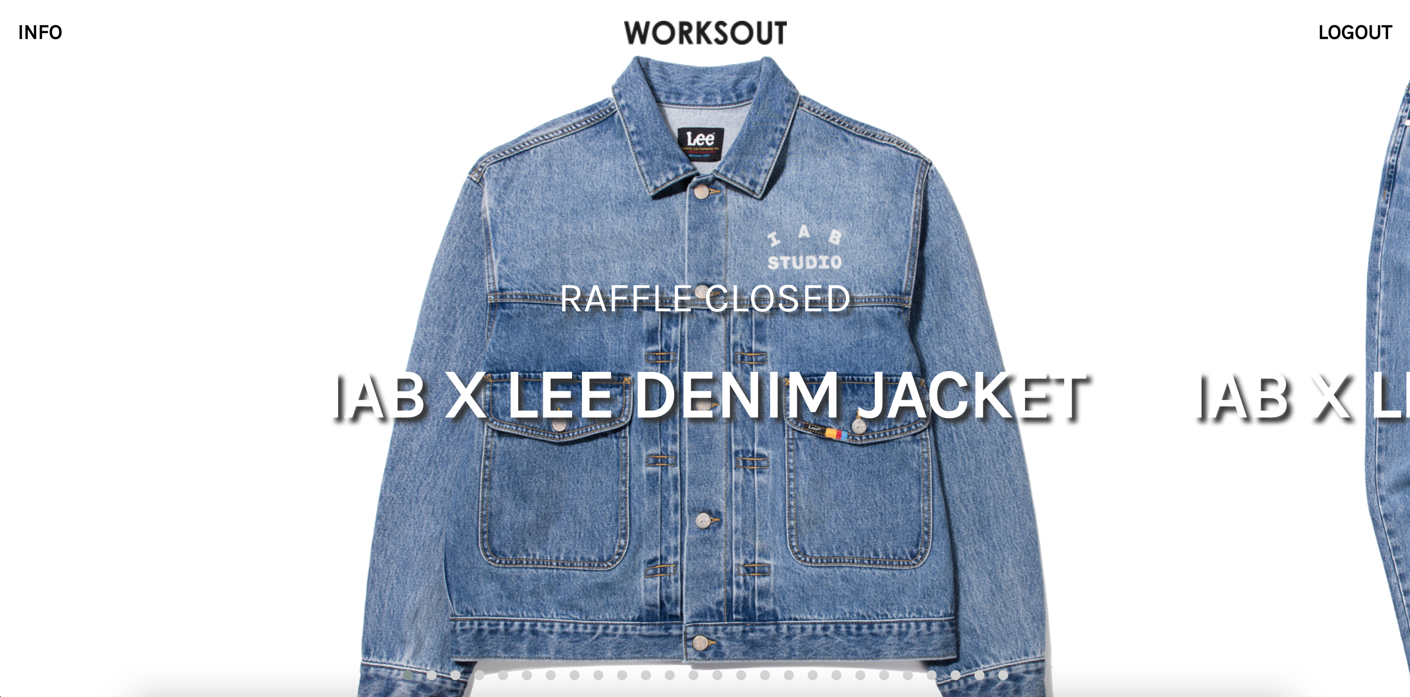 접속 대기가 끝나면 웍스아웃 라플 페이지가 나오게 되는데요, 좌측 상단의 'INFO' 버튼을 클릭해 본인이 응모한 제품과 당첨된 제품을 확인해주세요. 'INFO' 접속에도 많은 대기가 발생할 수 있으니 1~3분 정도 기다렸다가 접속해주세요.