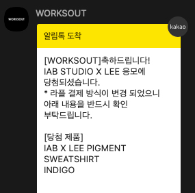 아이앱스튜디오 X 리(Lee) 라플 응모에서 하나의 제품이라도 당첨되었으면 이렇게 카카오톡으로 메시지를 받게 되는데요, 저는 인디고 컬러의 피그먼트 스웨트셔츠에 당첨되어서 이렇게 문자를 받았습니다.