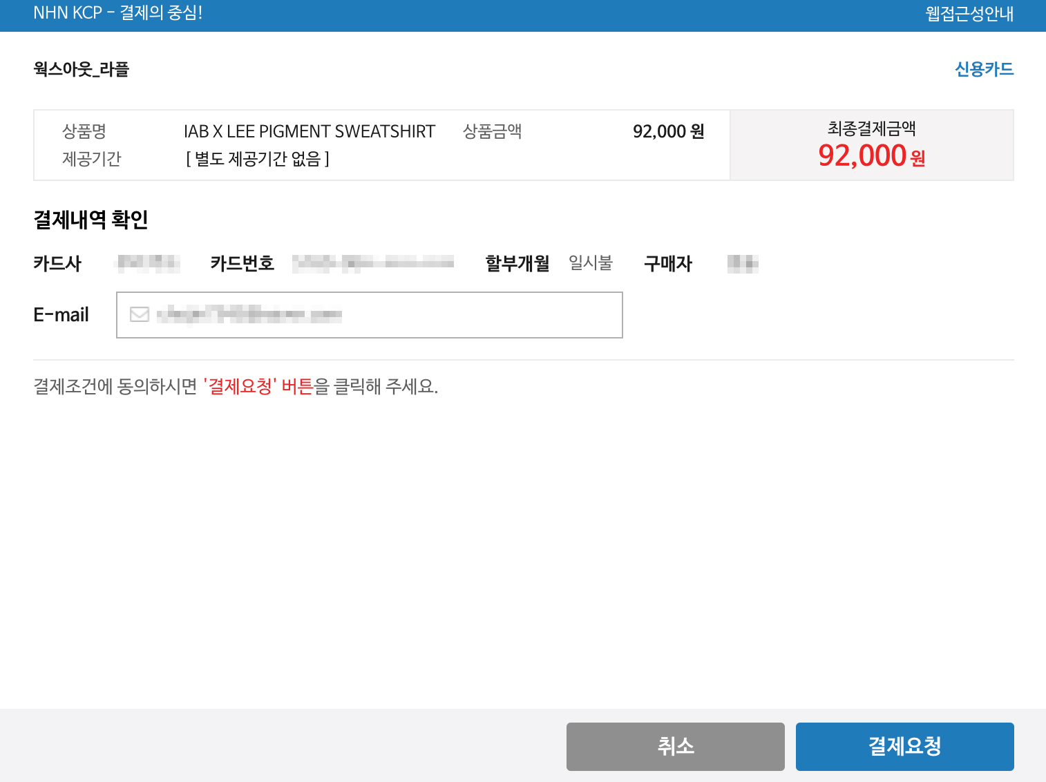 아이앱스튜디오 X 리(Lee) 피그먼트 스웨트셔츠의 원래 가격인 89,000원에 배송비 3,000원이 추가되어 총 92,000원을 결제하게 됐는데요, 신한은행, 현대카드, 국민은행, 비씨카드, 롯데카드, 하나카드, NH채움, 삼성카드, 우리카드 등에서 무이자 할부가 가능하니 결제할 때 참고해주세요.