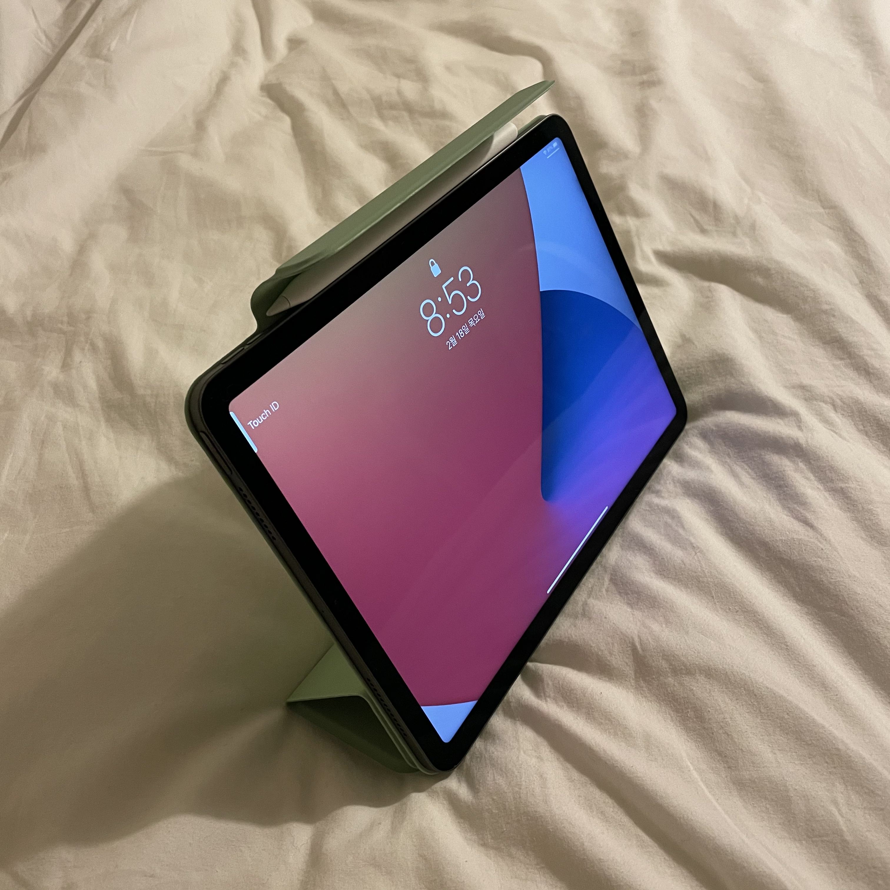 삼각형으로 접은 아이패드 커버의 위치를 조금 조정하면 아이패드를 눕혀서 사용할 수 있는데요, 제가 아이패드 에어4를 구입한 가장 큰 목적 중 하나인 아이패드 드로잉을 할 때 유용한 기능이었습니다. 드로잉뿐만 아니라 필기를 할 때도 상당히 유용할 것 같은데요, 특히 강의를 듣는 대학생들에게 추천해주고 싶었습니다.