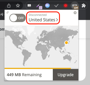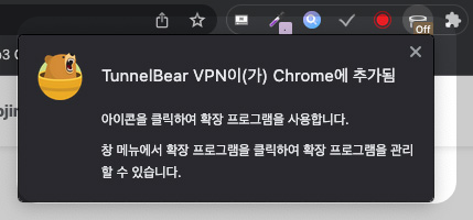 'TunnelBear VPN'을 크롬에 추가했다면 크롬창 우측 상단에 확장 프로그램으로 아이콘이 하나 뜰 텐데요, 해당 프로그램 아이콘을 누르면 현재는 연결이 되지 않은 상태라고 표시됩니다.