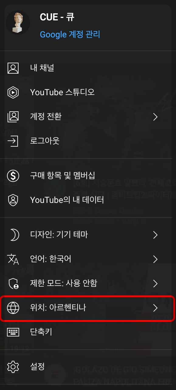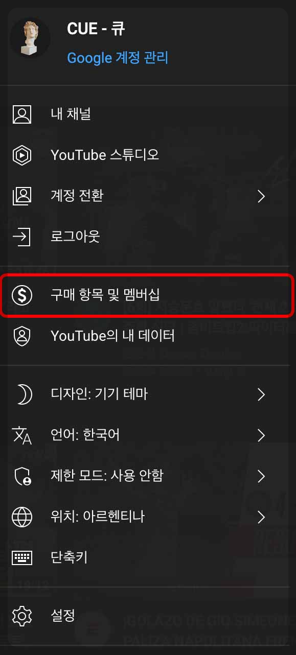 유튜브 위치가 아르헨티나로 잘 설정됐다면 이제 유튜브 프리미엄 서비스 가입을 해주면 되는데요, 방금 확인했던 프로필의 위치 메뉴에서 조금만 위로 올라가면 보이는 '구매 항목 및 멤버십' 메뉴를 클릭해 줍니다.
