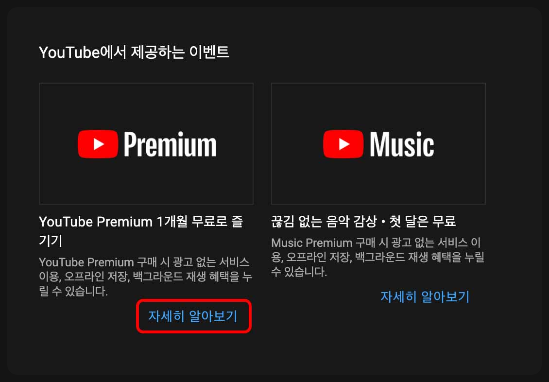 '구매 항목 및 멤버십' 메뉴를 클릭하게 되면 위 사진과 같이 '유튜브 프리미엄 1개월 무료로 즐기기'와 '끊김 없는 음악 감상' 서비스 두 개가 나오게 되는데요, 우리는 유튜브 프리미엄 서비스 결제를 하려고 하기 때문에 왼쪽 하단의 '자세히 알아보기' 버튼을 클릭해 줍니다.