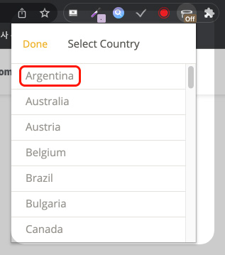 그래서 일단 우리는 접속하고자 하는 나라를 선택해줘야 하는데요, 지도 위의 국가를 선택하는 메뉴를 눌러서 가장 상단에 위치한 아르헨티나를 선택해 줍니다.