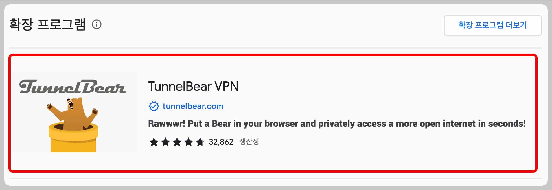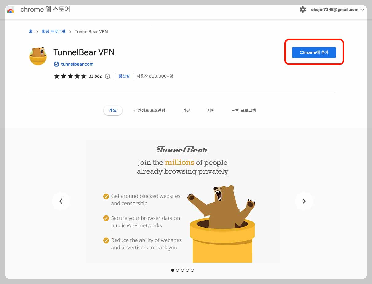 크롬 확장 프로그램 'TunnelBear VPN'가 나오게 되면 우측 상단의 'Chrome에 추가'를 클릭해서 프로그램을 추가해 주세요.