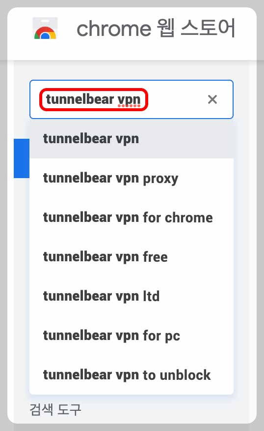 크롭 웹 스토어에 접속했다면 왼쪽 상단에 프로그램을 검색할 수 있는 검색창이 보일 텐데요, 검색창에 'tunnelbear vpn'이라고 검색해 줍니다.