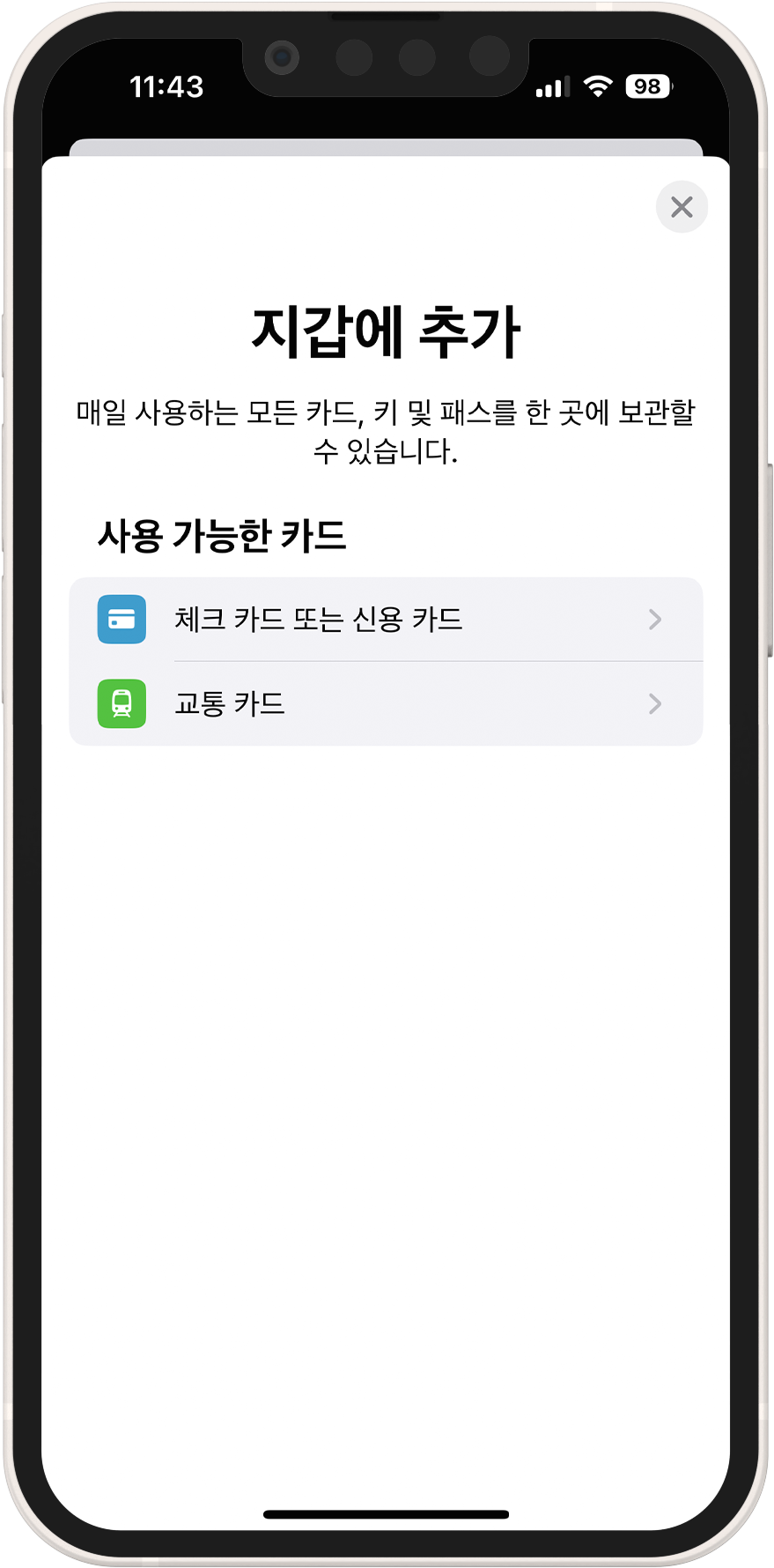 2. 사용 가능한 카드 중 '신용카드, 체크카드'와 '교통카드' 중 선택 (교통카드는 추후 지원)