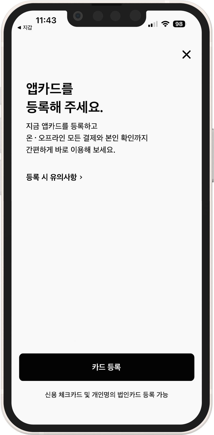 아직은 현대카드만 등록 가능 (신용카드, 체크카드 모두 가능)