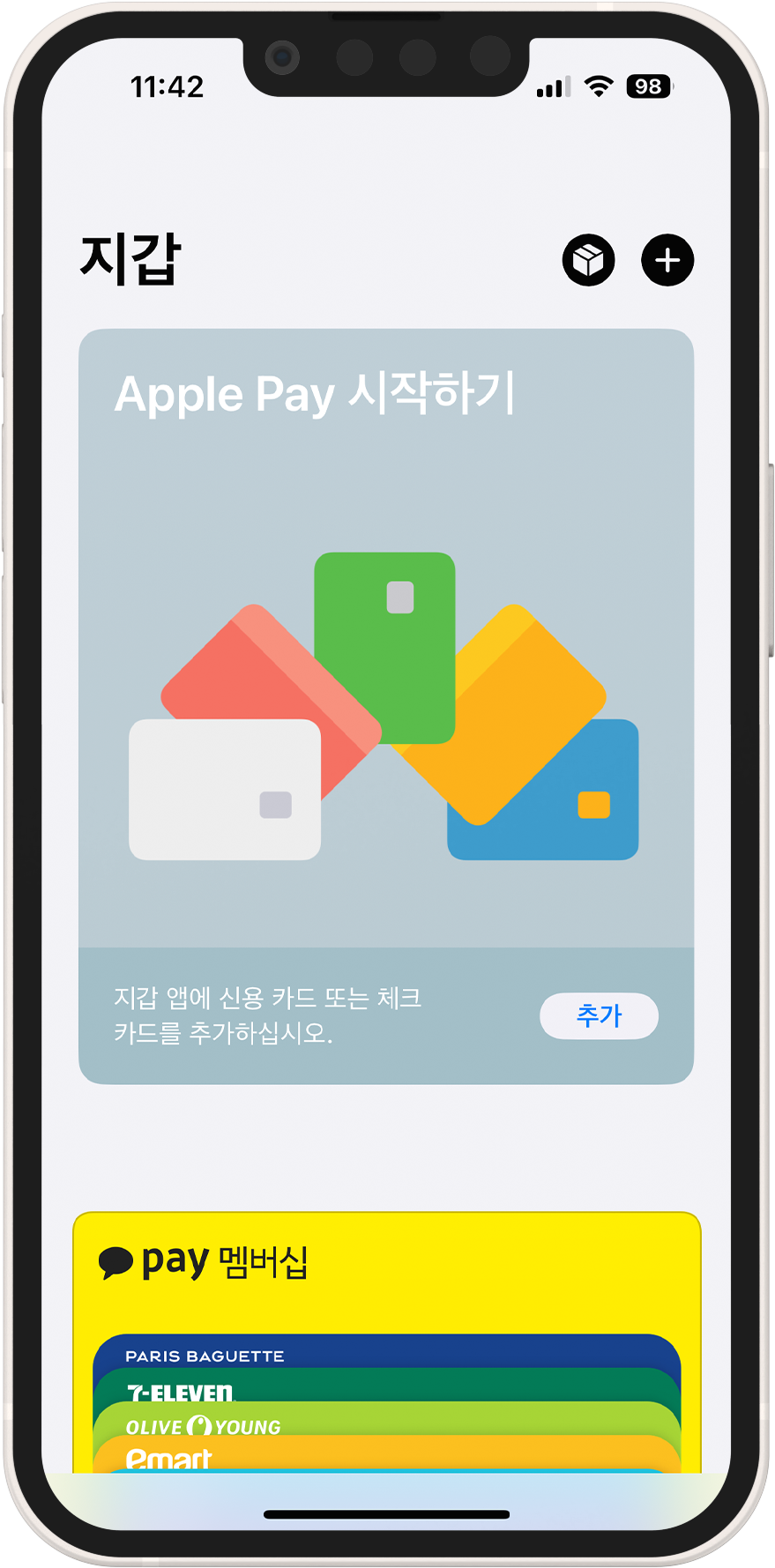 1. 아이폰 내 지갑 (월렛) 앱에서 우측 상단 플러스 (+) 버튼 클릭