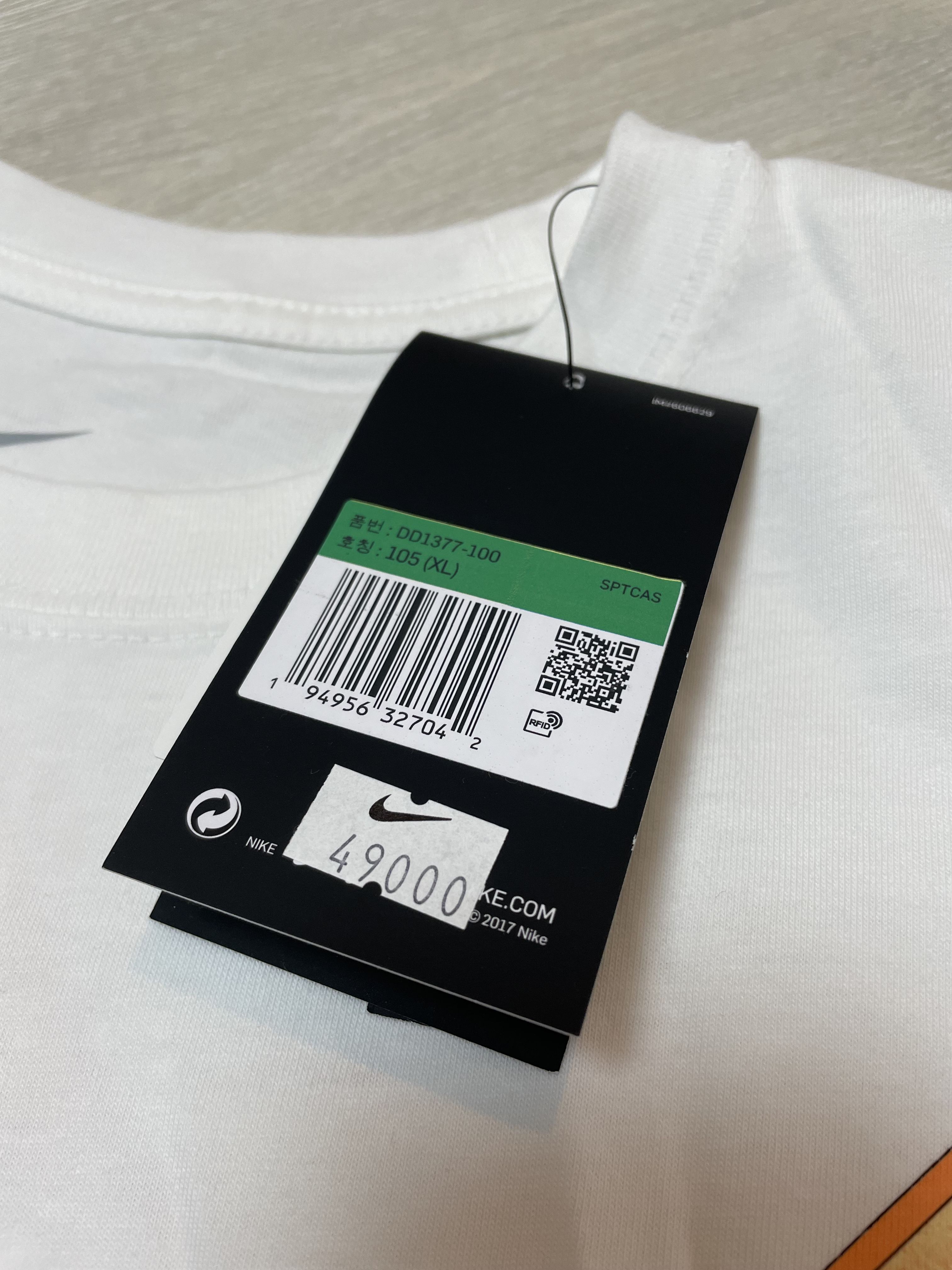 두 번째로 리뷰할 제품 역시 반팔 티셔츠인데요, 나이키 스포츠웨어 MYLK 반팔 티셔츠 AS 제품입니다. 해당 제품 역시 정식 가격은 49,000원으로 앞선 프렌치 테리 반팔 티셔츠와는 달리 중량감이 느껴지는 면 소재로 되어 있어요.