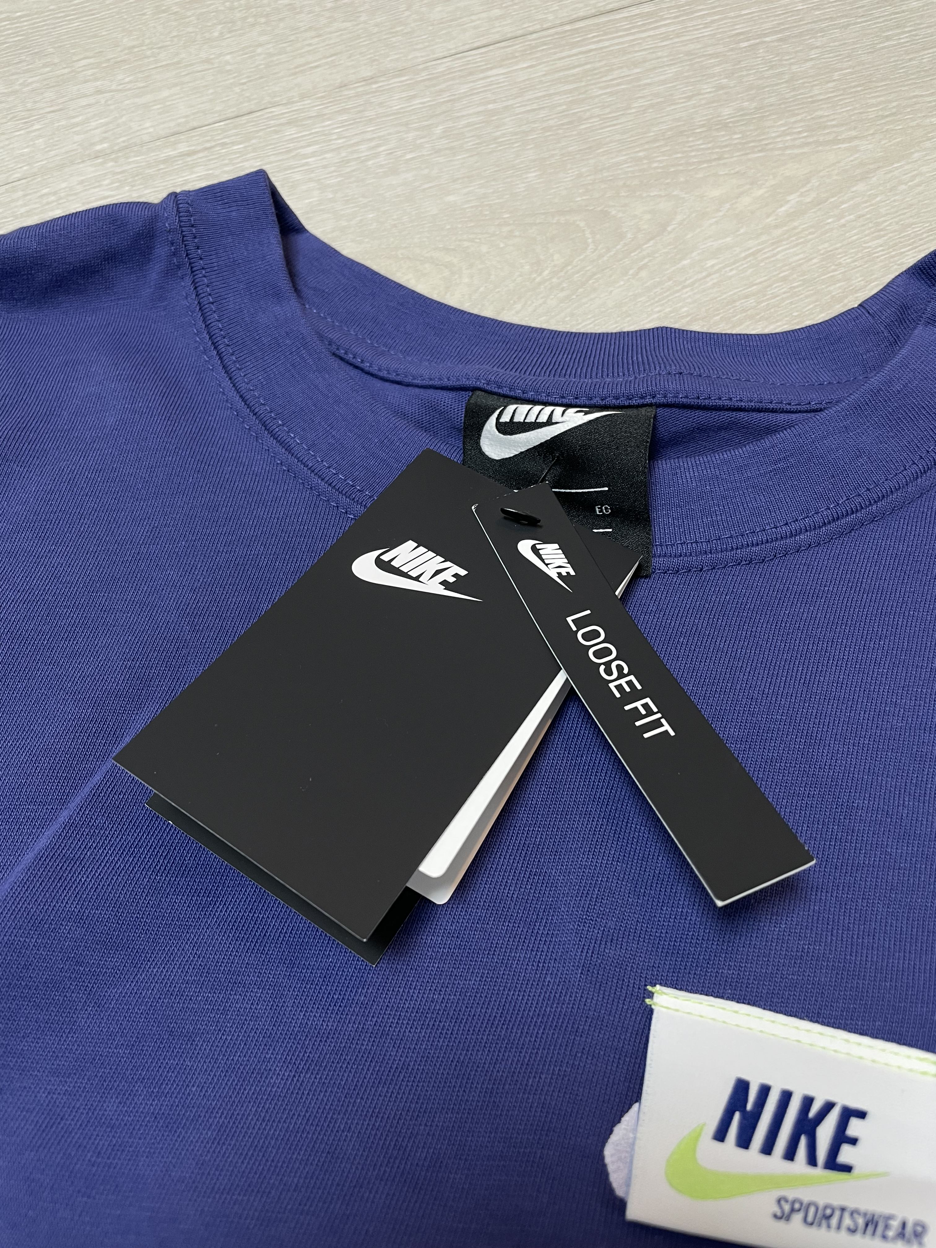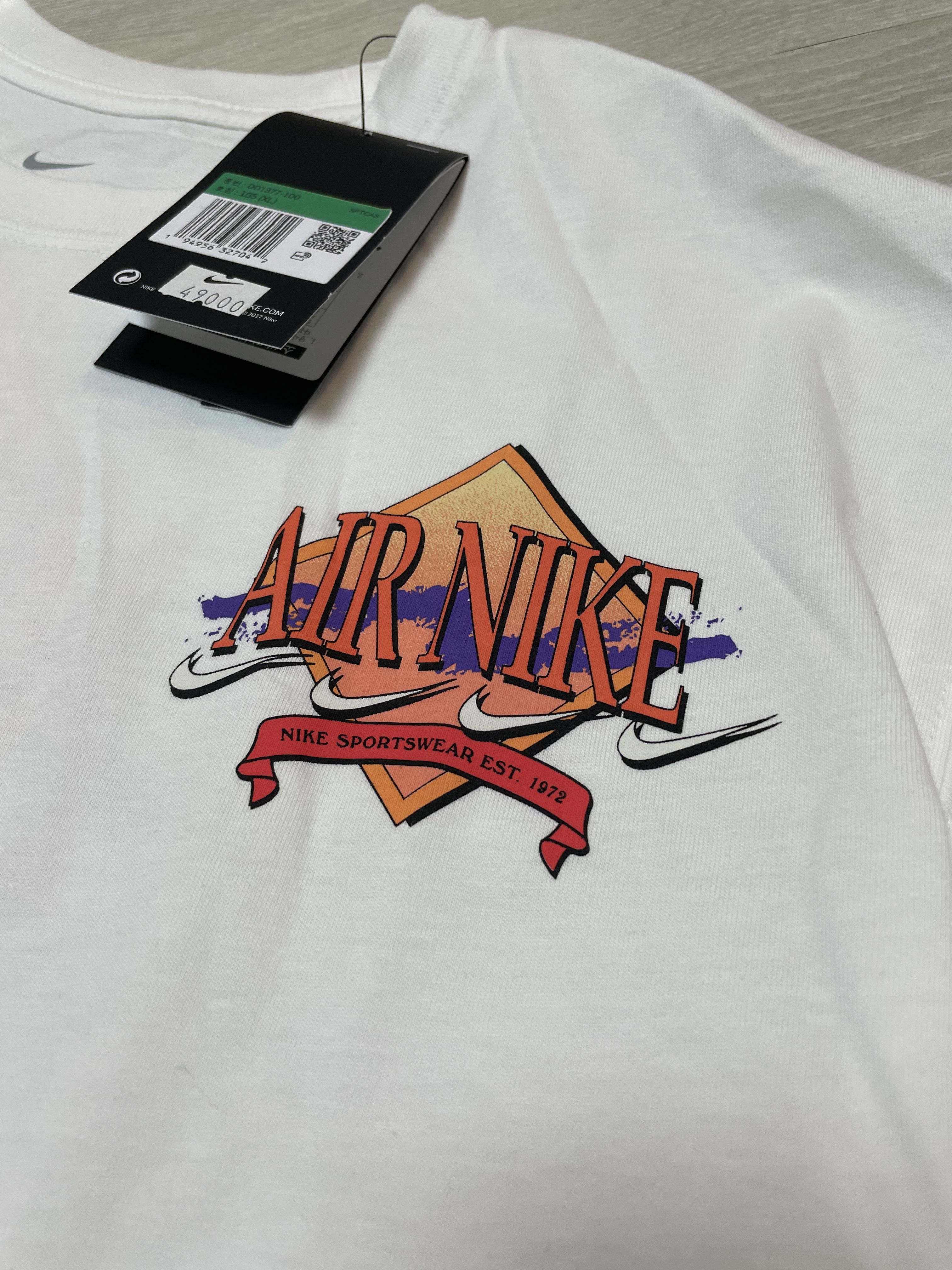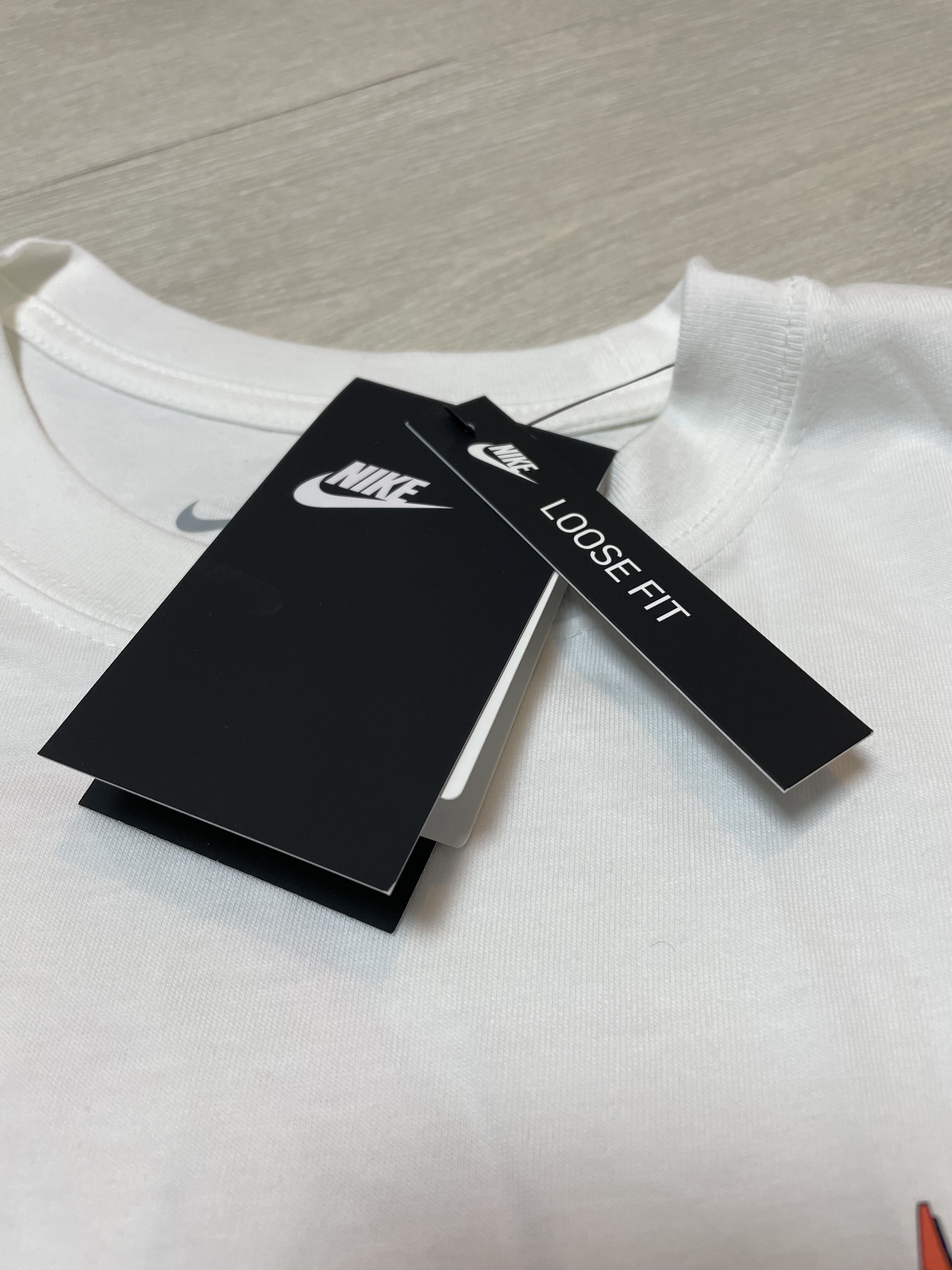 첫 번째 리뷰할 제품은 나이키 스포츠웨어 프렌치 테리 반팔 티셔츠 AS 제품인데요, 빈티지한 나이키 그래픽 로고와 핏을 담은 스포츠웨어 티셔츠입니다. 해당 제품의 정식 가격은 49,000원으로 넉넉한 느낌의 루즈 핏과 면, 폴리에스터 소재로 된 중간 무게감의 구조가 특징인데요, 드롭 숄더, 긴소매, 가슴에서 엉덩이까지 떨어지는 여유로운 핏으로 편안하고 캐주얼한 연출이 가능할 것 같아요.