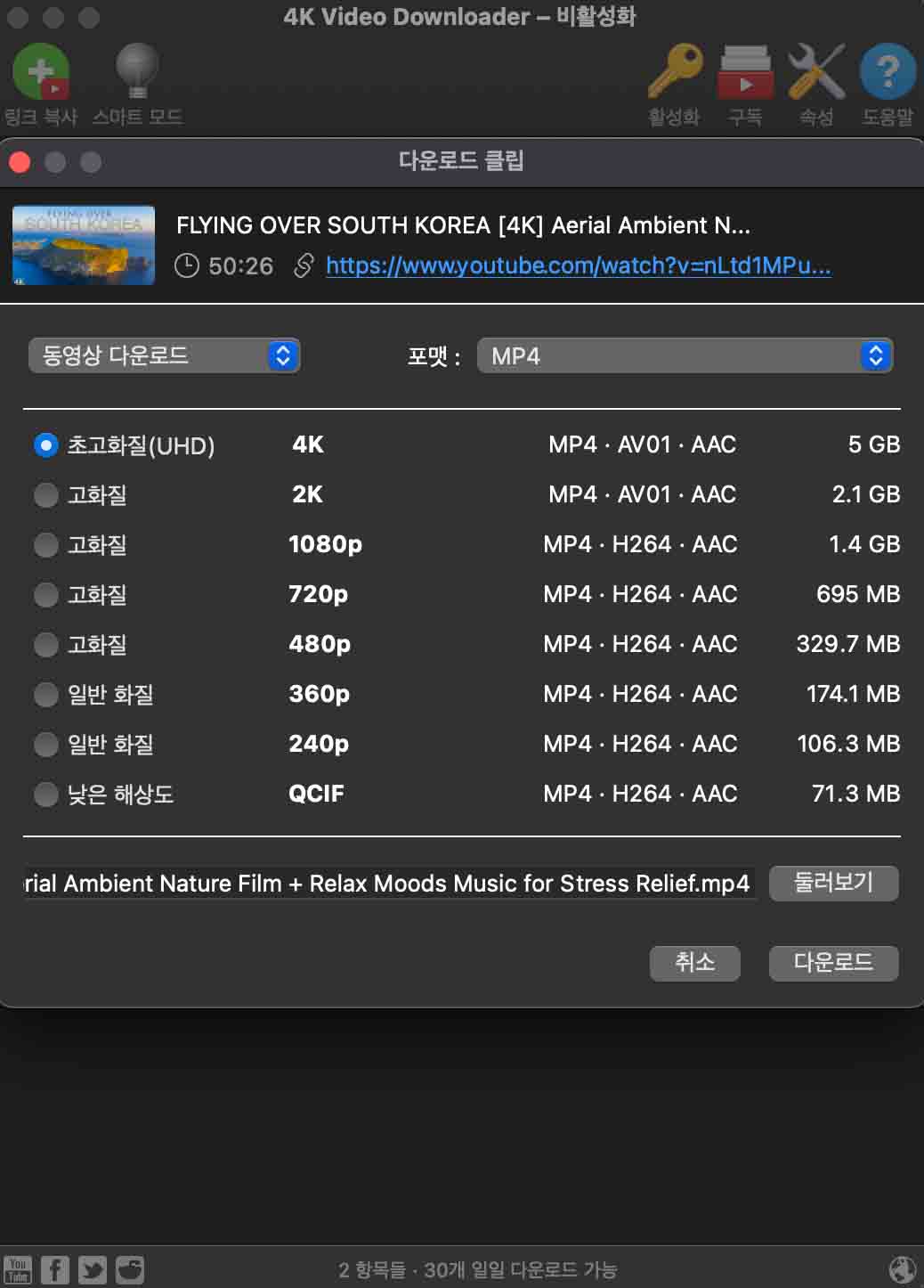 4K Video Downloader의 가장 큰 장점은 바로 유료 서비스를 결제하지 않아도 동영상의 원본 화질 그대로 다운로드 받을 수 있다는 점입니다.