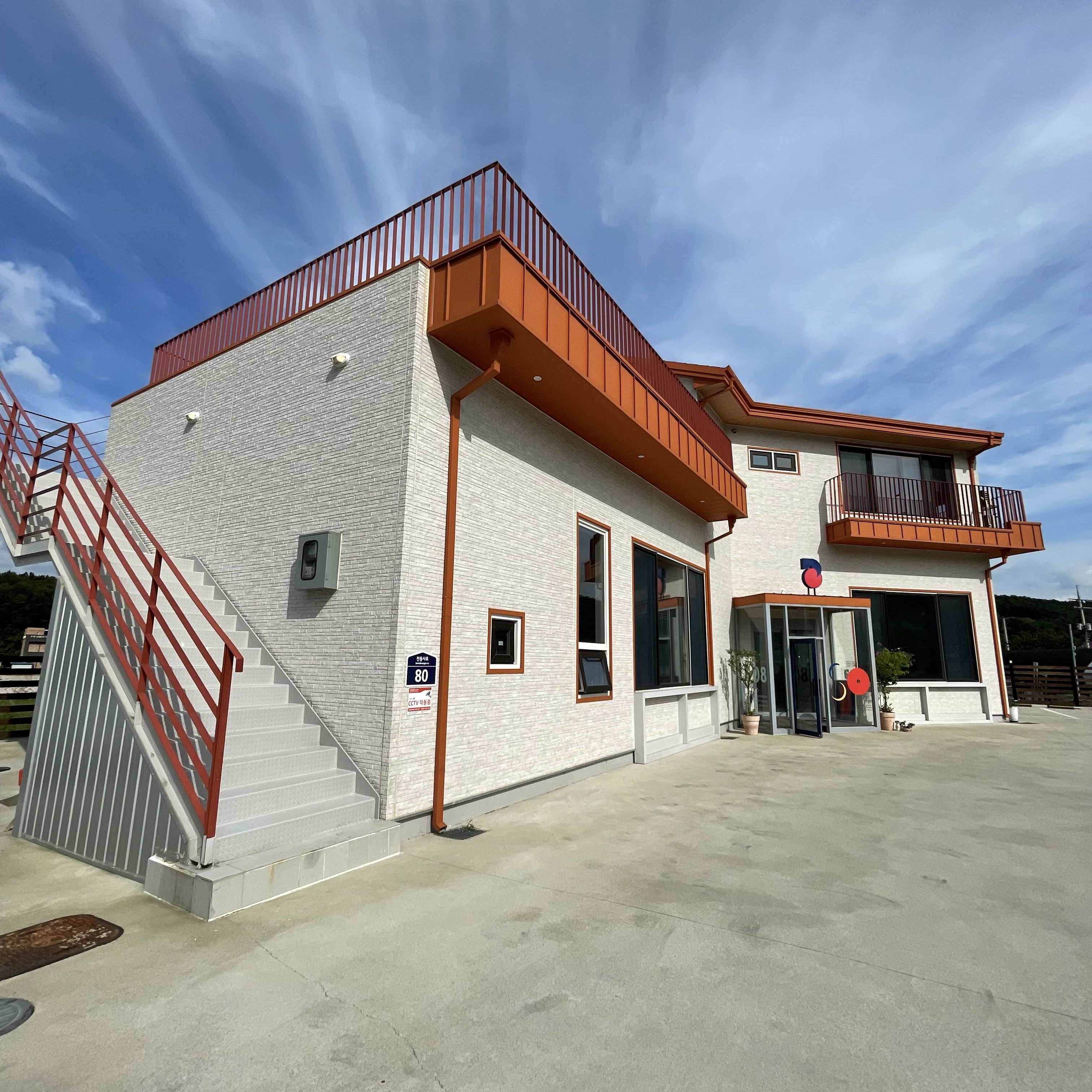 오렌지 컬러의 지붕과 테라스, 창틀로 포인트를 준 이쁜 벽돌집이었어요. 그리고 건물 앞 넓은 마당은 모두 주차 공간으로 활용 가능하여 차량을 이용하는 손님들도 부담 없이 오갈 수 있어요.