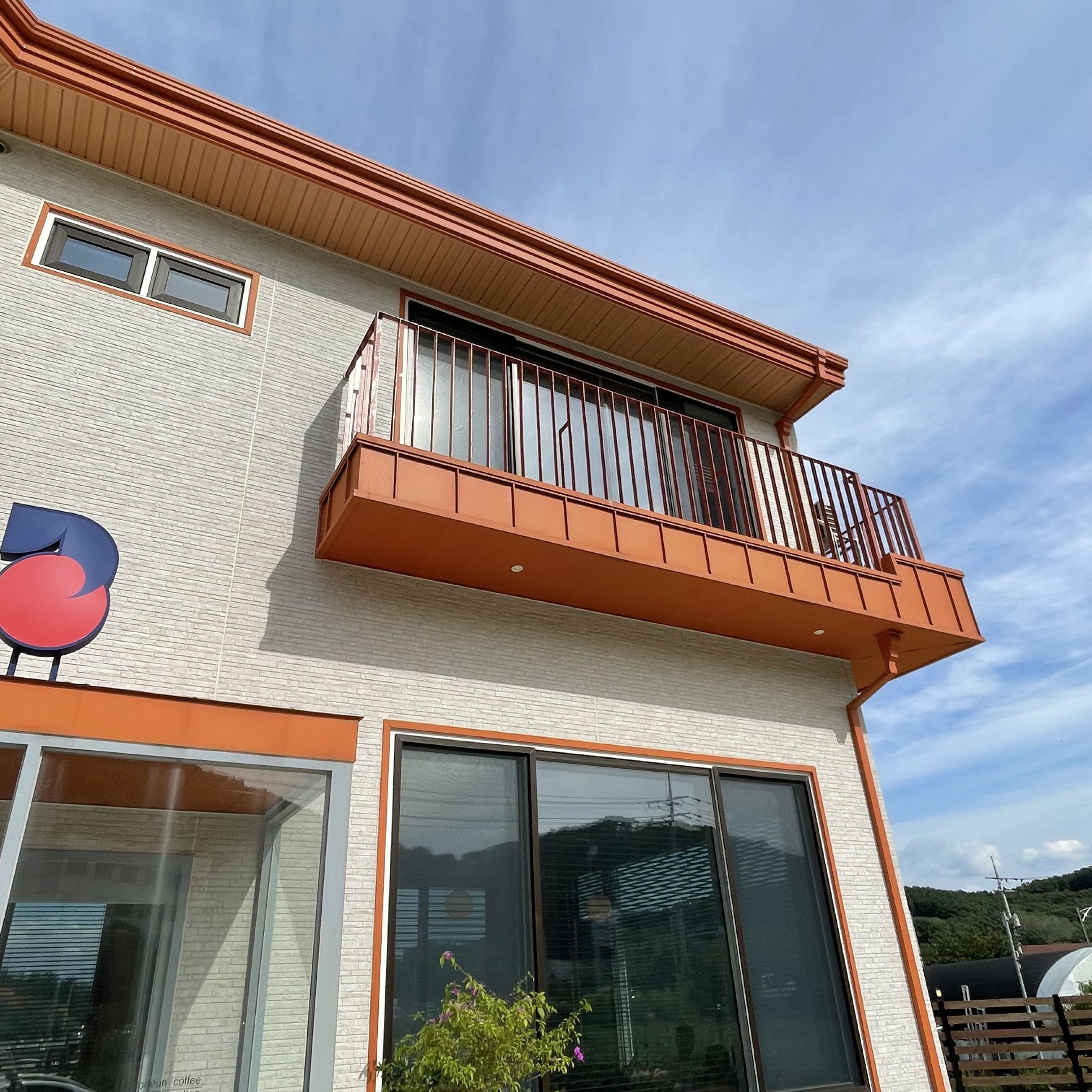 오렌지 컬러의 지붕과 테라스, 창틀로 포인트를 준 이쁜 벽돌집이었어요. 그리고 건물 앞 넓은 마당은 모두 주차 공간으로 활용 가능하여 차량을 이용하는 손님들도 부담 없이 오갈 수 있어요.