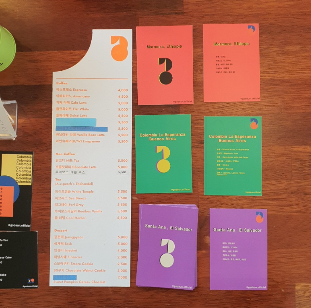 컵받침에 있는 도형은 카페 곧은의 로고인 것 같네요. 로고는 카페 이름 뜻과는 다르게 곧지 않은 둥글둥글한 느낌이 들어요.