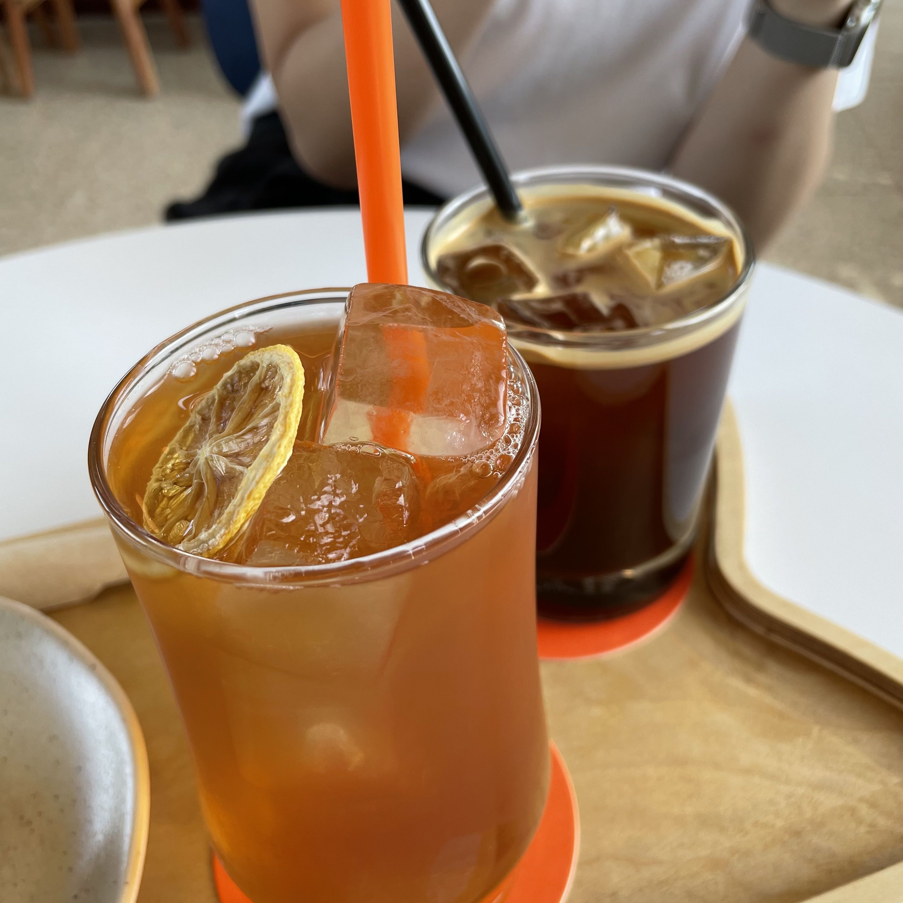 카페 곧은의 포인트 컬러가 오렌지인 것 같아요. 건물 외관도 그렇고, 음료를 들어보니 컵받침도 오렌지 컬러더라고요. 아무래도 아메리칸스탠다드 인테리어의 포인트 컬러가 오렌지, 옐로우, 블루 이런 비비드한 색감이라서 그런 것 같아요.
