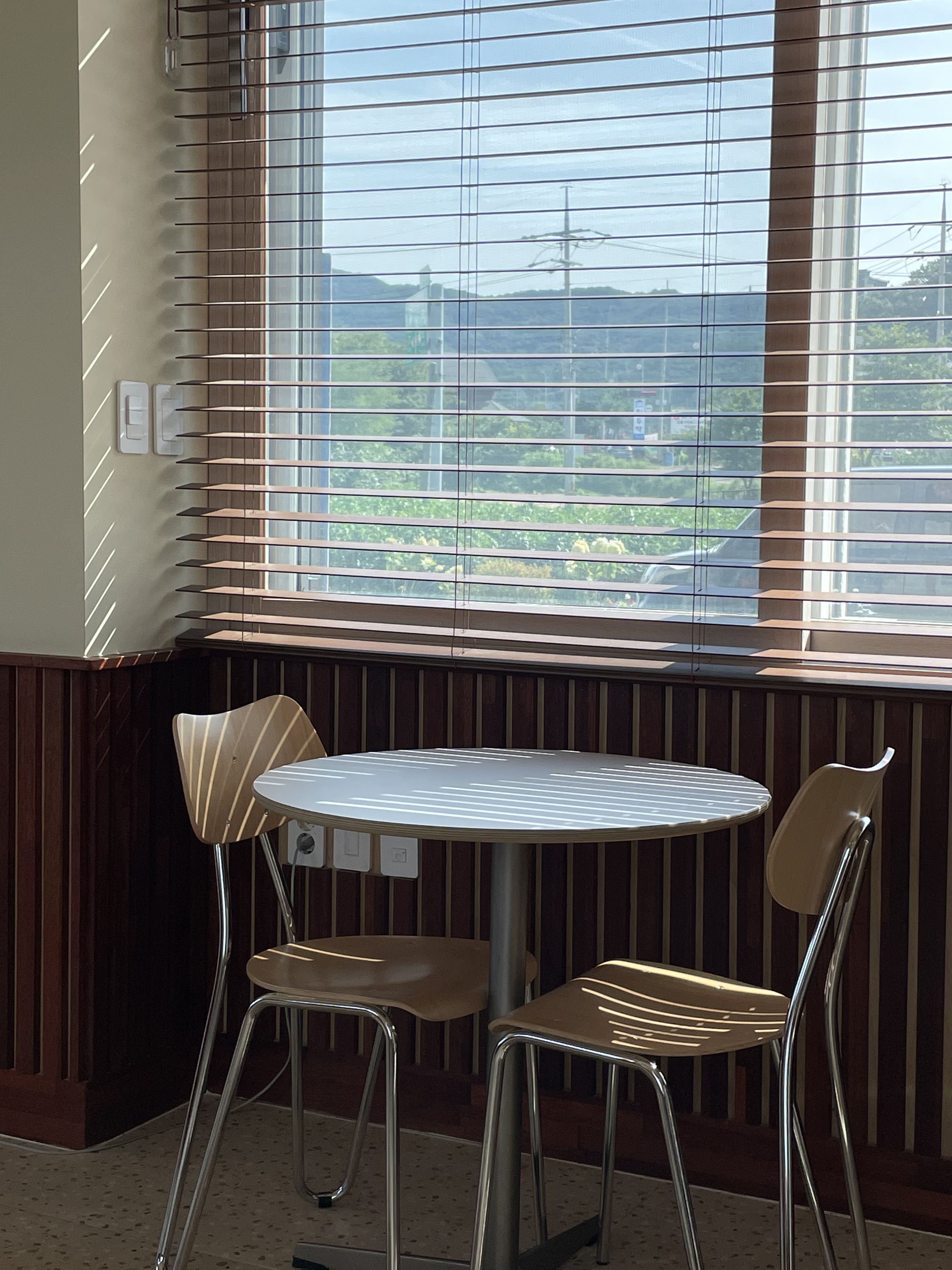 카페 곧은은 인테리어가 특히 제 스타일이었어요. 평소 원목 인테리어를 선호하는데 곳곳의 가구들과 블라인드 사이로 들어오는 햇빛까지 인테리어 연출을 이쁘게 잘해놨더라고요.