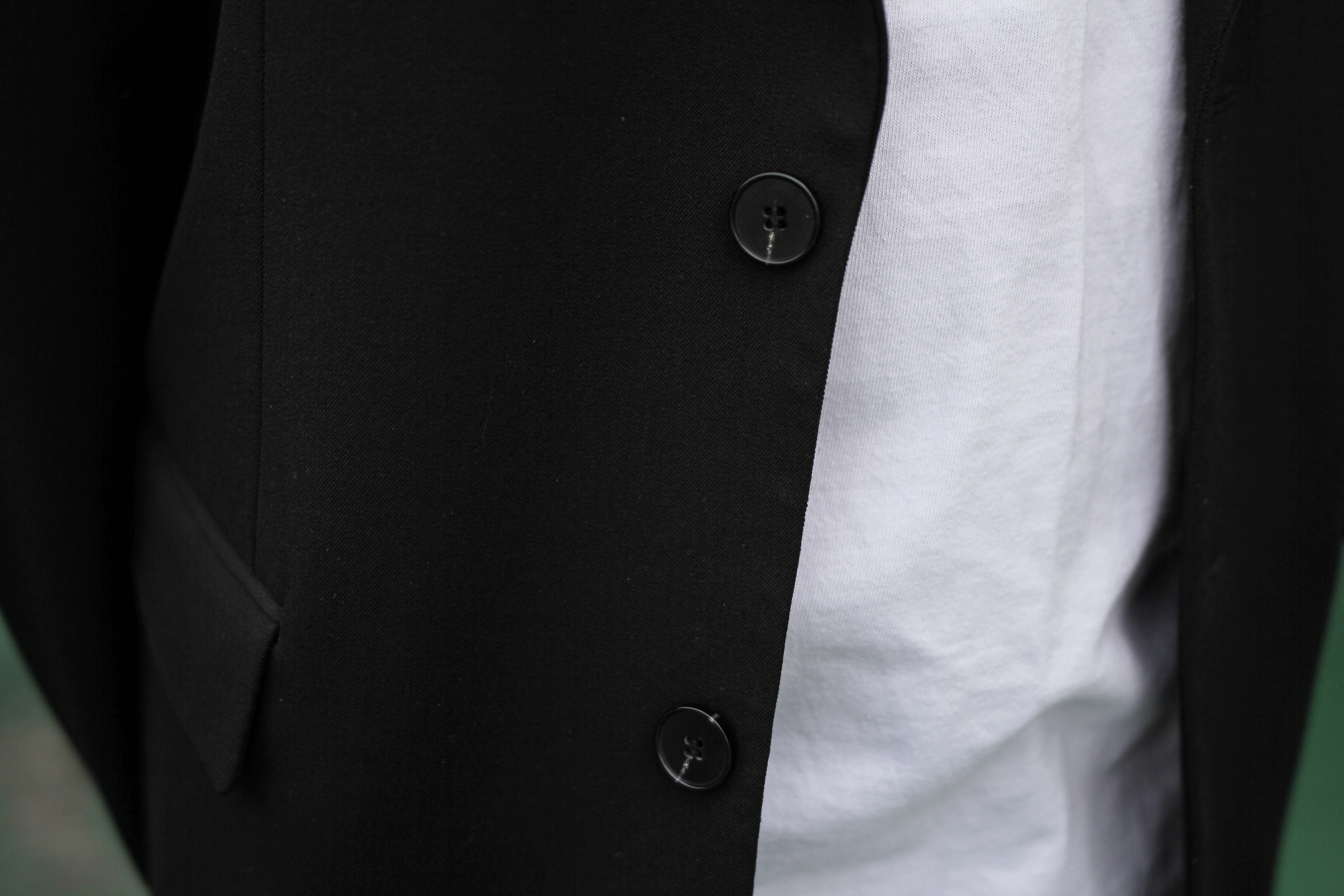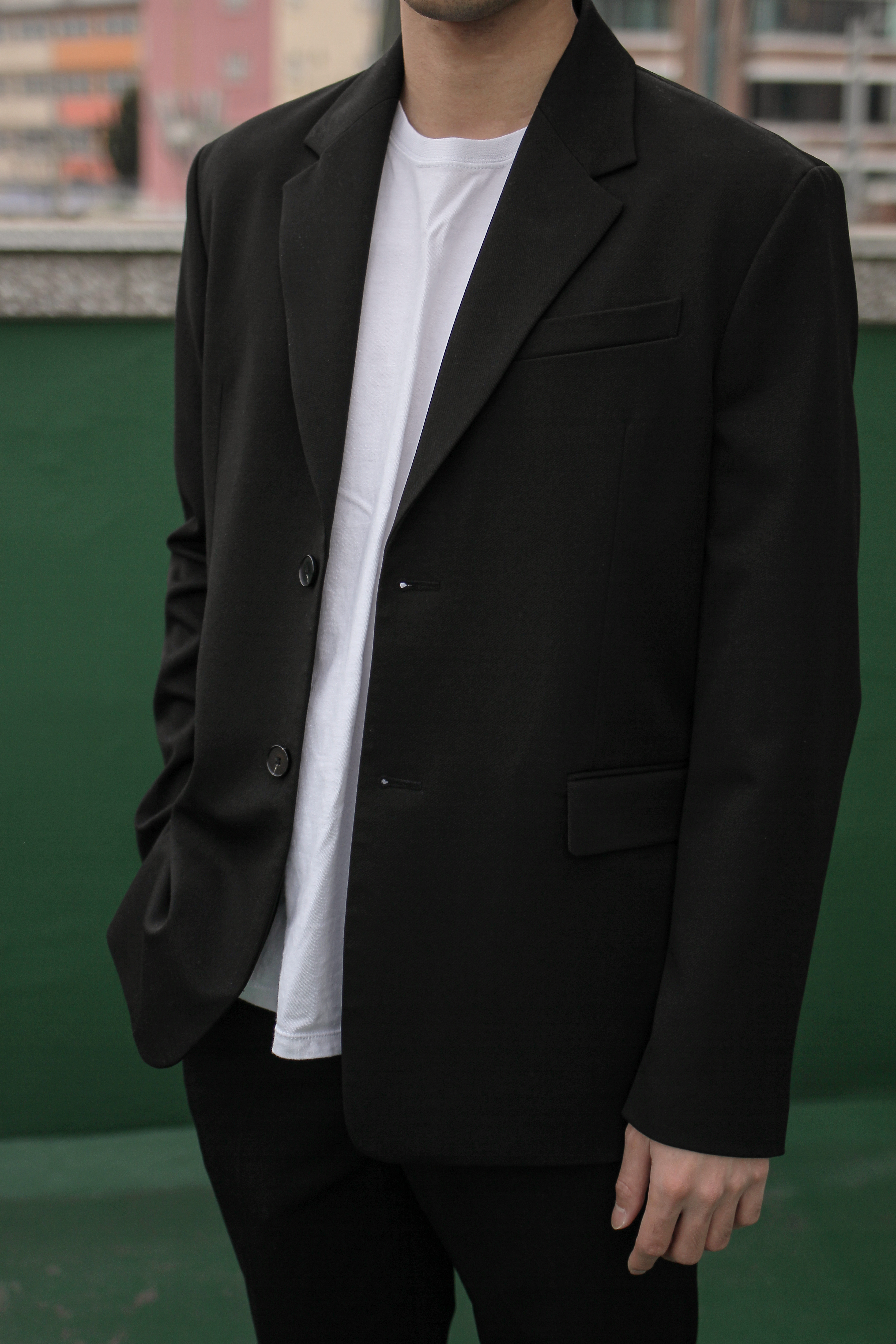 드로우핏 오버사이즈 블레이저의 소재는 패브릭으로 광택이 없고 밀도가 높아서 구김이 잘 가지 않아요. 그리고 오리지널 미국식 블레이저와는 다르게 단추는 총 2개가 달려 있어요.