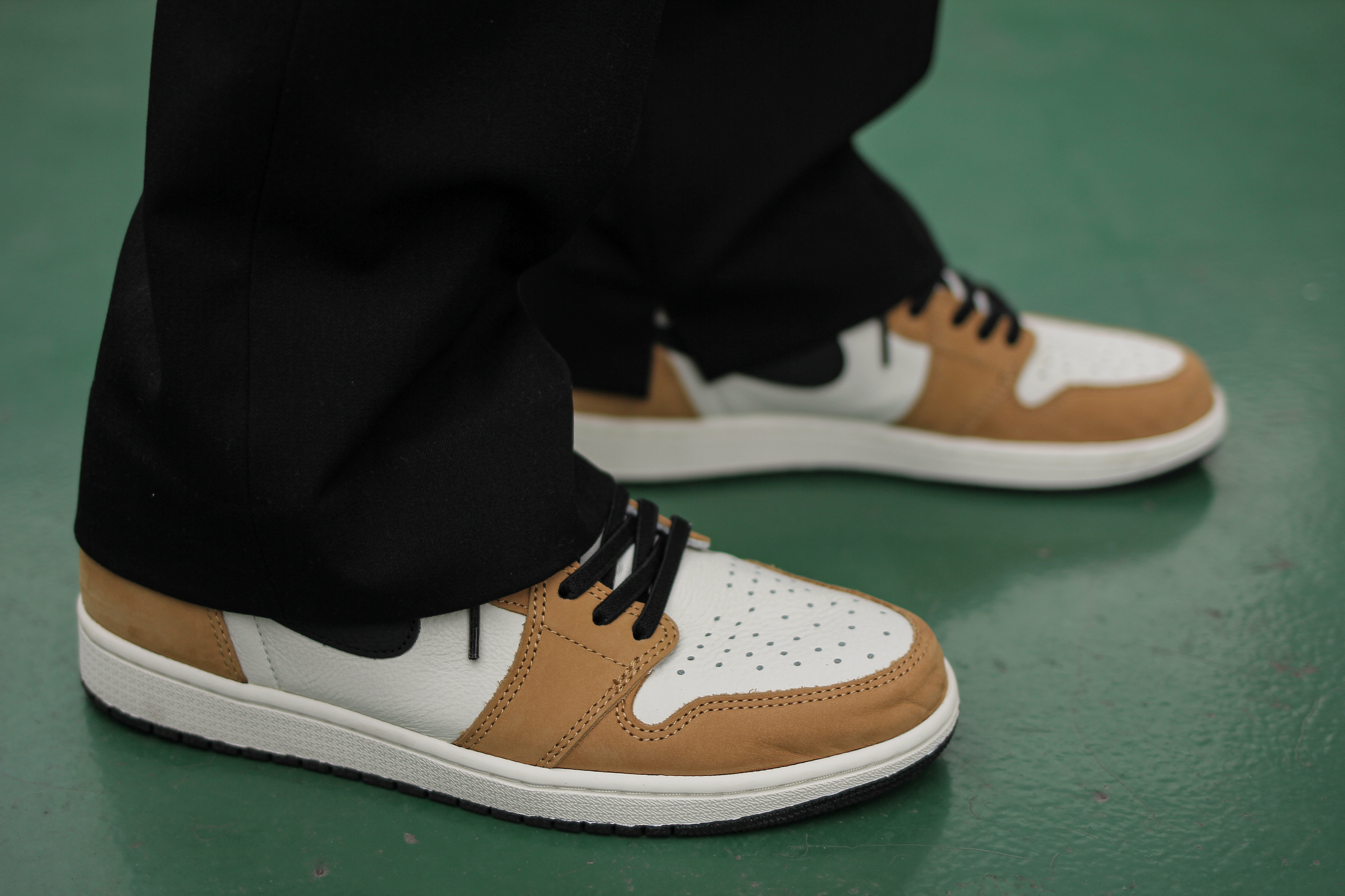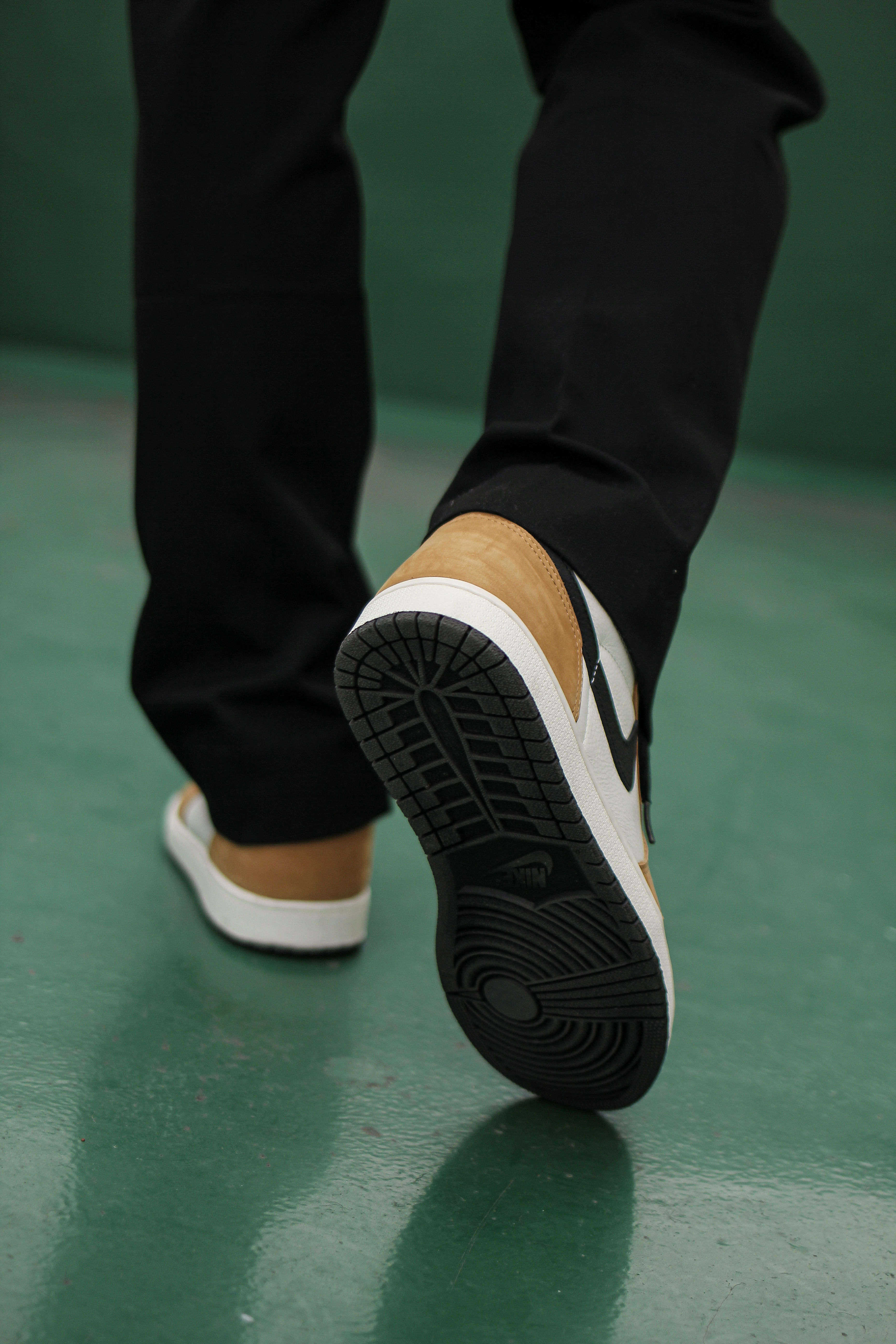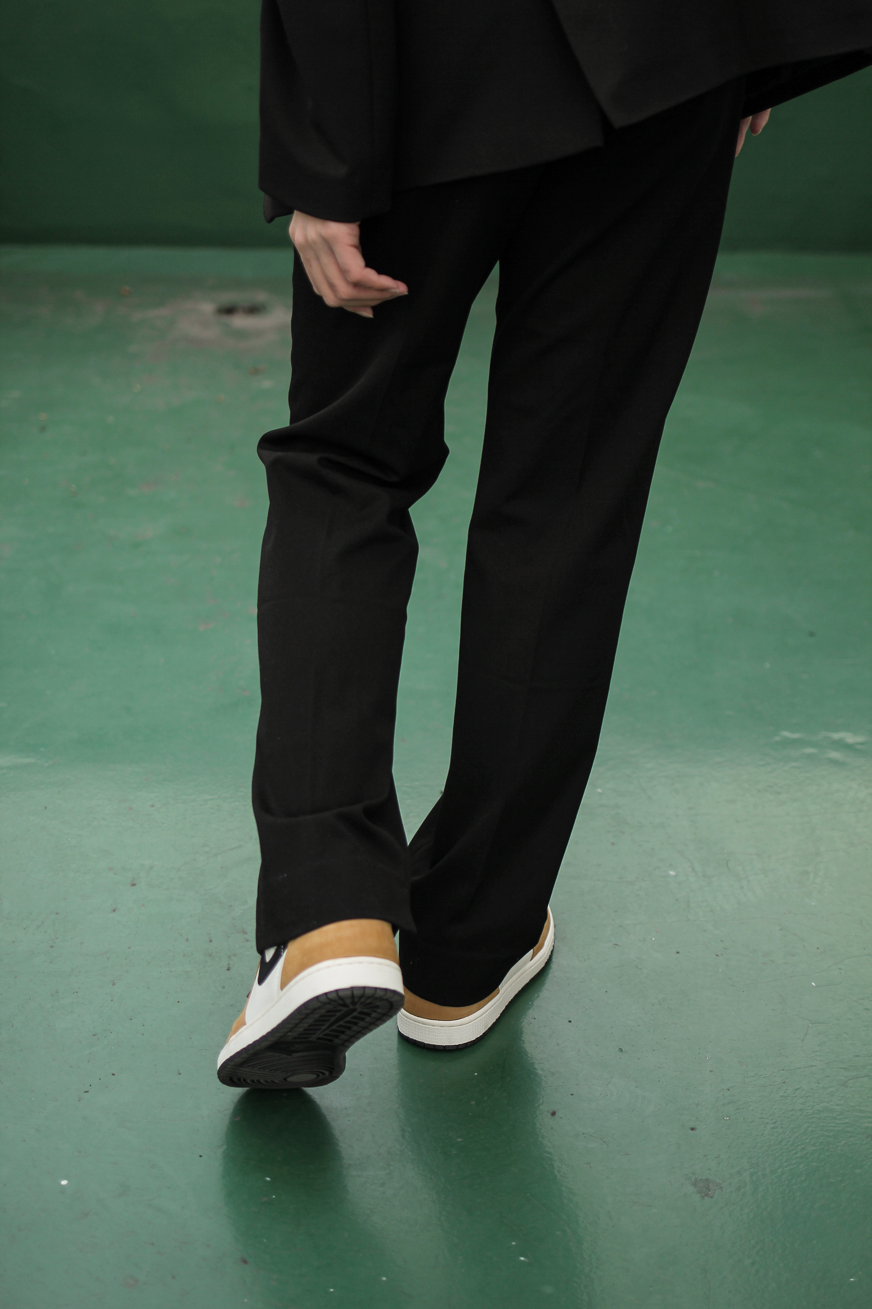 많은 분들이 조던1 제품을 조거 팬츠를 활용해 스타일링할 텐데요, 저 같은 경우는 이렇게 와이드 슬랙스 또는 진을 활용해서 연출하는 걸 정말 좋아해요. 조던1의 실루엣이 모두 다 드러나는 것보다 살짝 덮여서 나이키 스우시가 보일 듯 말듯해 보이는 스타일이 매력적이더라고요.
