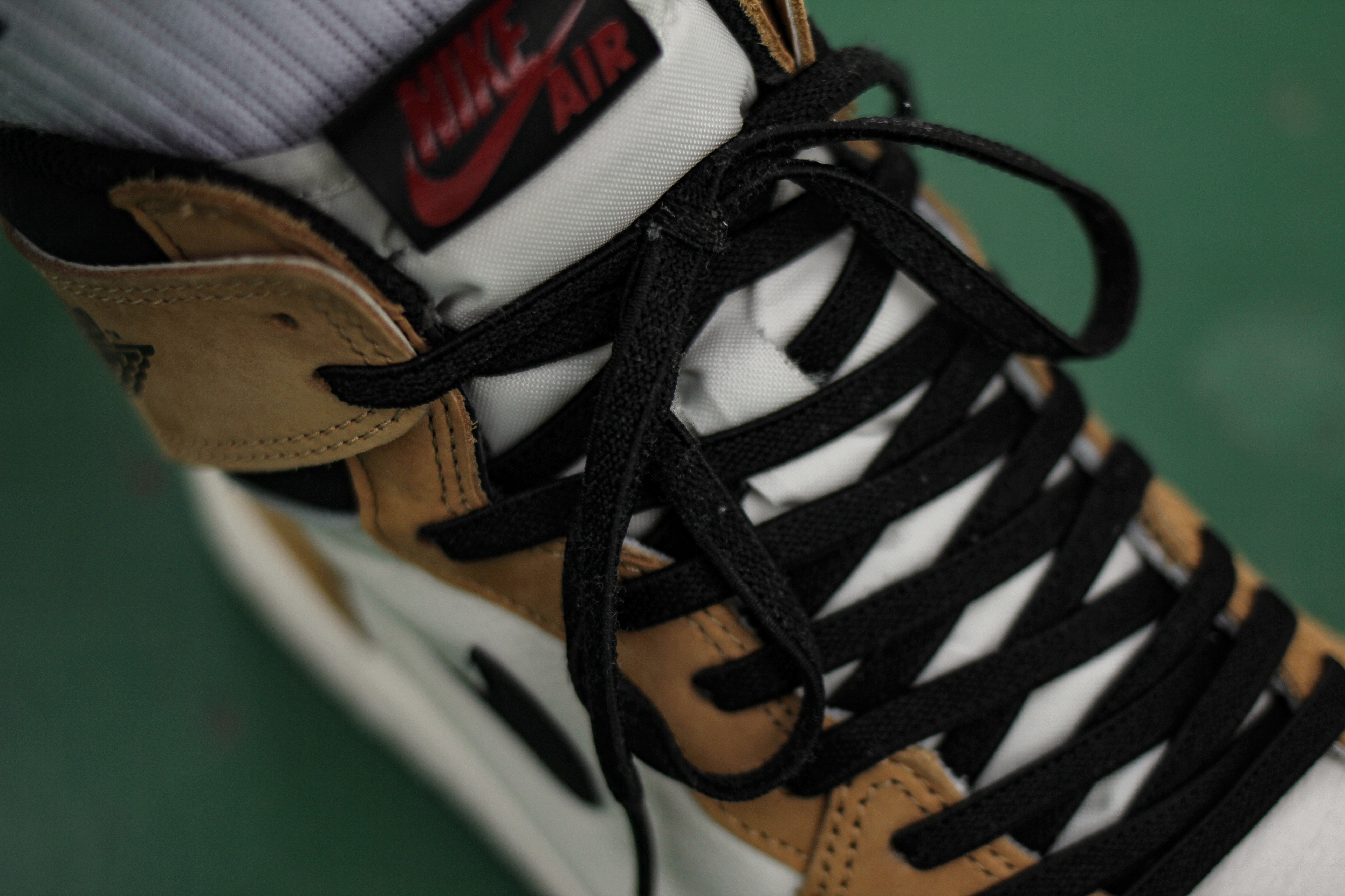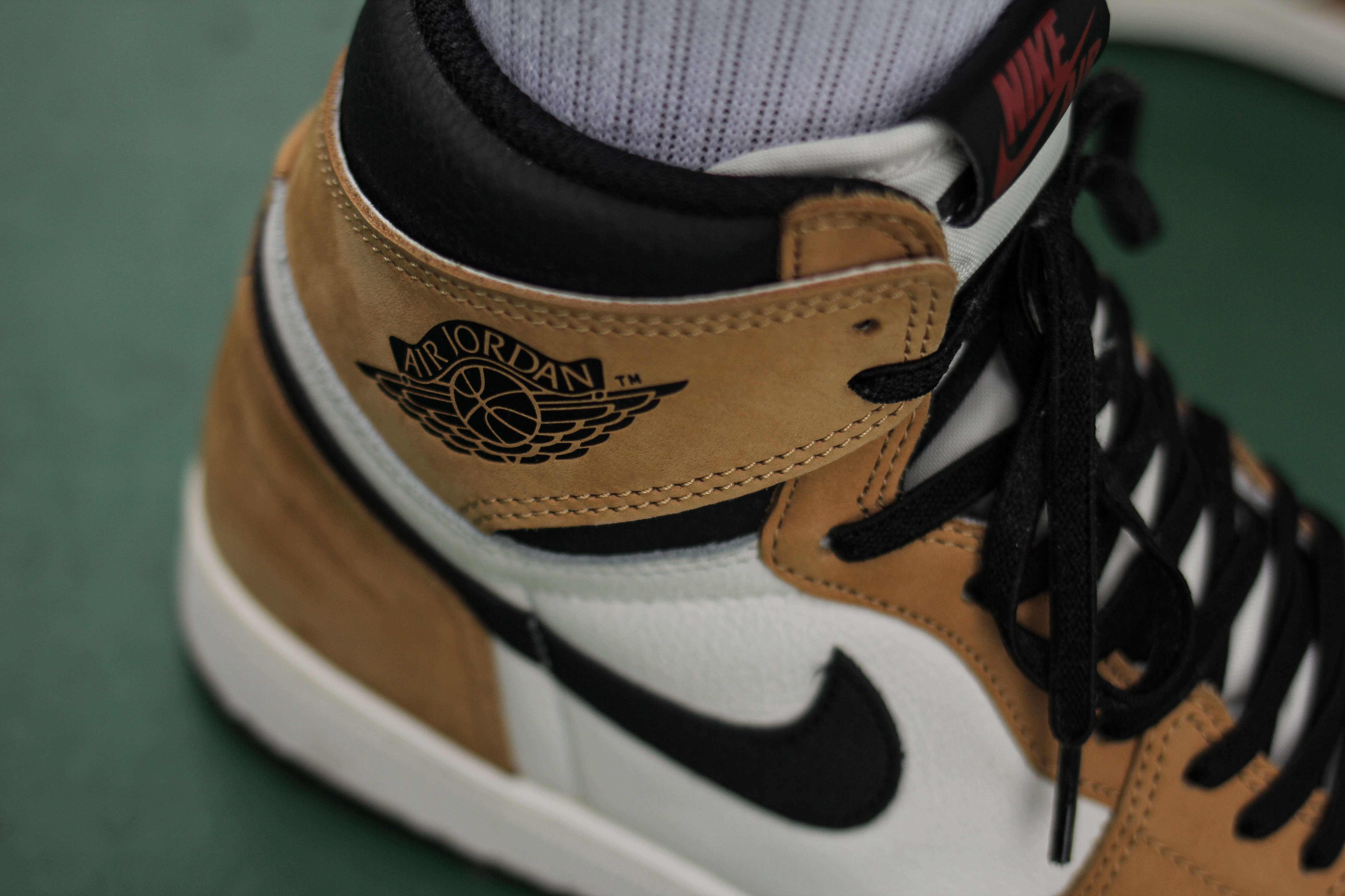 에어 조던1의 윙 로고인데요, 이 루키오브더이어 제품은 마이클 조던이 신인이던 시절 신인상, 즉 루키오브더이어를 수상할 때 입고 있었던 셔츠의 컬러를 본 따서 만들어진 제품이에요. 윙 로고 역시 에어 조던1의 타제품과는 다르게 날개처럼 열리는 형태인데요, 안쪽 부분에는 마이클 조던의 신인 시절 업적과 수상 당시 했던 말이 타이핑되어 있어요.