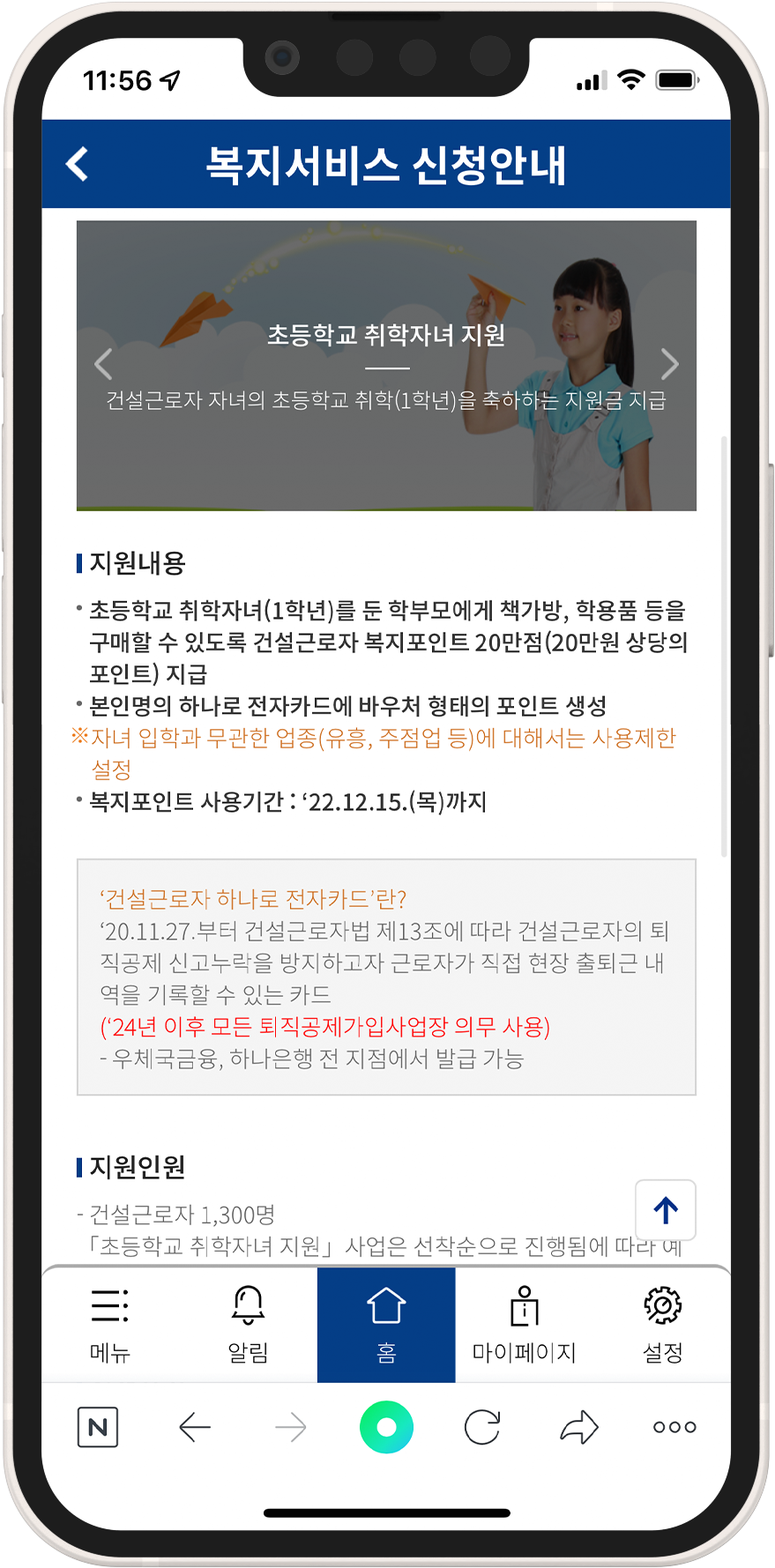 인구 급감 시대에 결혼 및 출산 지원, 자녀 양육에 대한 사회적 책임을 함께하고자 건설근로자공제회에서 실시하는 '초등학교 취학자녀 지원' 사업의 일환으로 20만 원 상당의 책가방, 학용품 등을 구매할 수 있도록 지원한다.