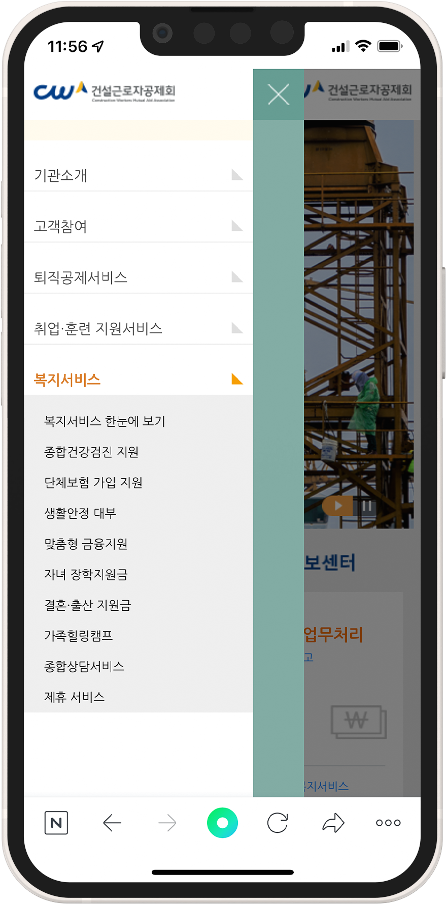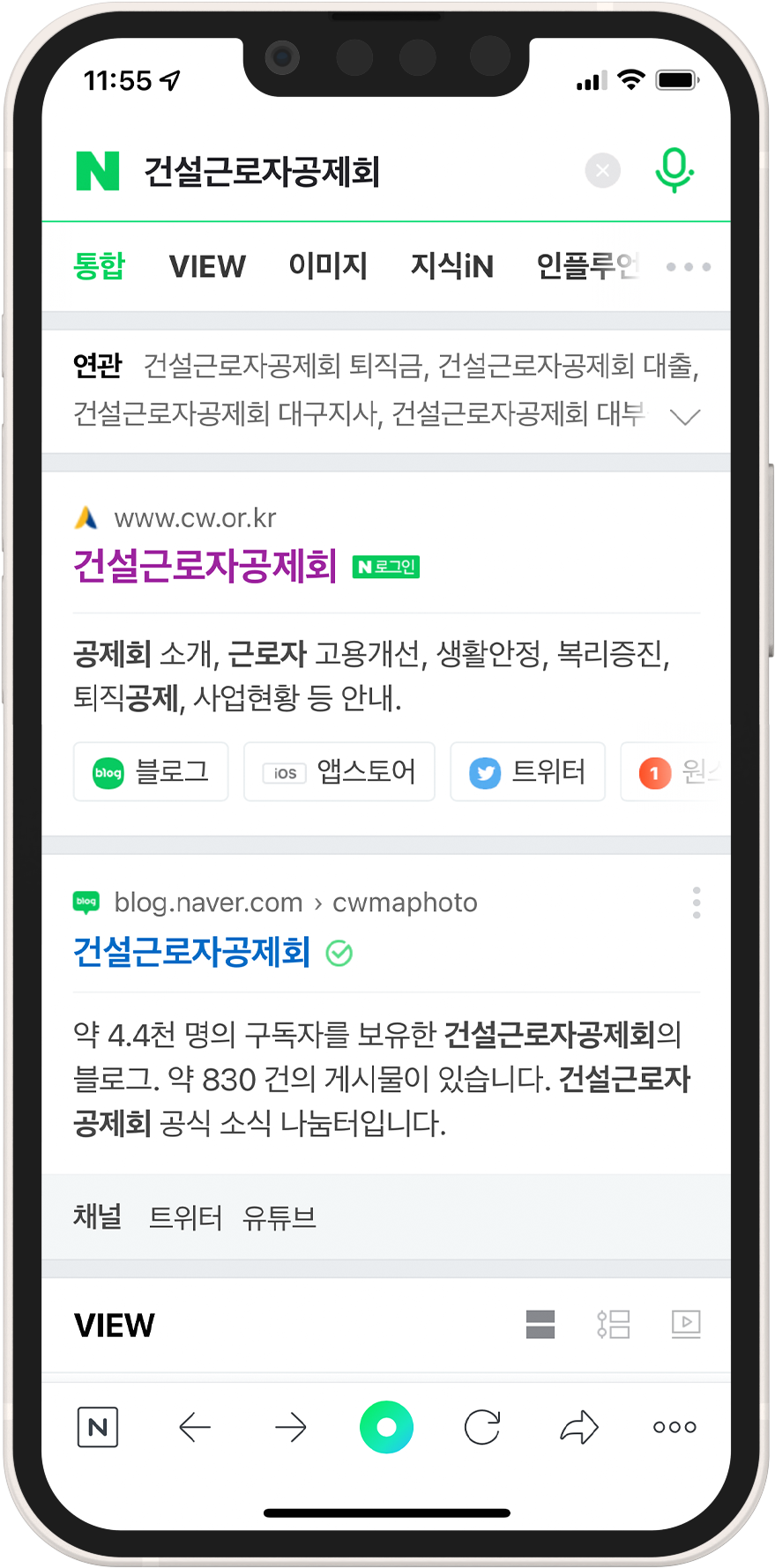 온라인 신청 방법으로는 PC와 모바일 둘 다 가능한데요, 저는 모바일 기준 (IOS 15.4)으로 설명해 드리겠습니다. 우선 포털 사이트에서 '건설근로자공제회'를 검색해 주세요.