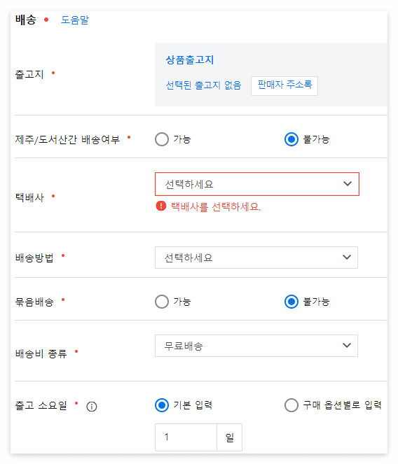 위 화면 중 오른쪽을 보면 상품 배송관련하여 여러 가지 옵션을 선택할 수 있는데요, 상품을 배송할 택배사부터 배송비 종류, 출고 소요일까지 다양한 기능을 통해 좀 더 효율적인 비즈니스를 할 수 있는 곳이 바로 쿠팡윙 판매자센터입니다.