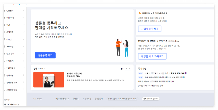 이렇게 두 개의 사이트는 전혀 다른 기능을 하고 있기 때문에 많은 분이 쿠팡 마켓플레이스로 들어가서 로그인을 했는데 판매 관리를 할 수 있는 창이 뜨지 않는다라고 하죠.