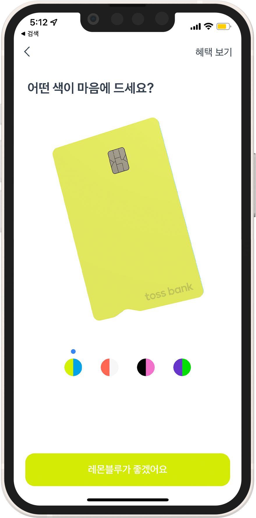 개인 정보 입력을 마무리했다면 마지막으로 토스뱅크를 오프라인에서 이용할 때 사용할 카드를 선택하면 되는데요, 디자인은 총 4가지로 저는 레몬 블루 컬러를 선택했어요.