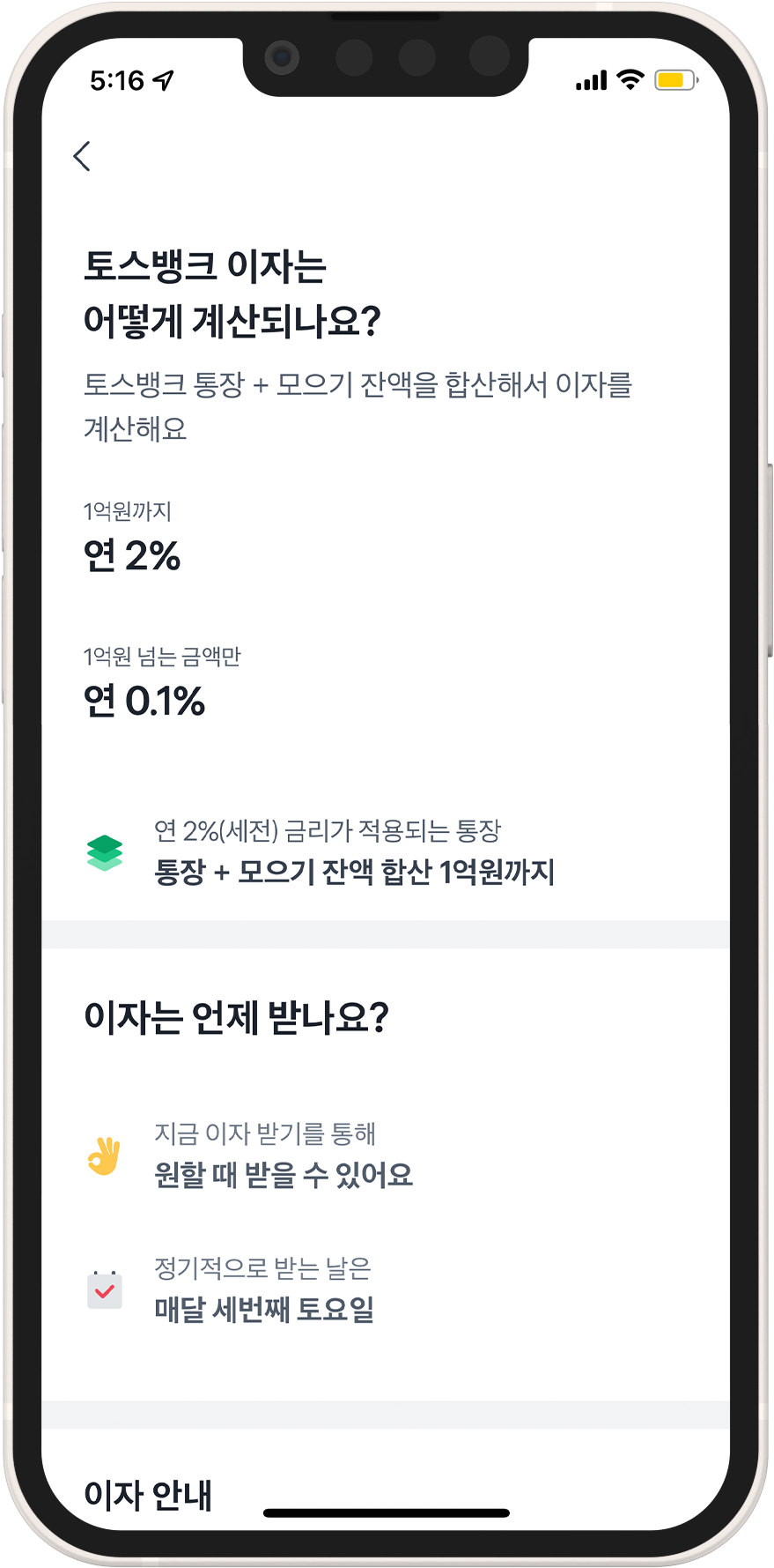 이러한 사용자 중심의 단순한 서비스 외에 토스뱅크의 가장 큰 장점이라고 하면 바로 세전 연 2%의 이자를 지급해주는 수시 입출금 통장이라는 것인데요, 국내 금융 업계에서는 최초로 고객들이 원할 때 바로 본인의 이자를 지급받을 수 있도록 하고 있습니다.