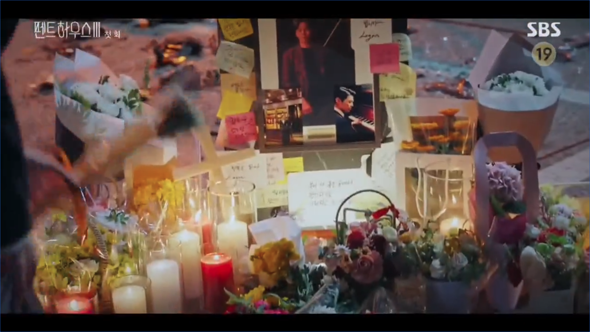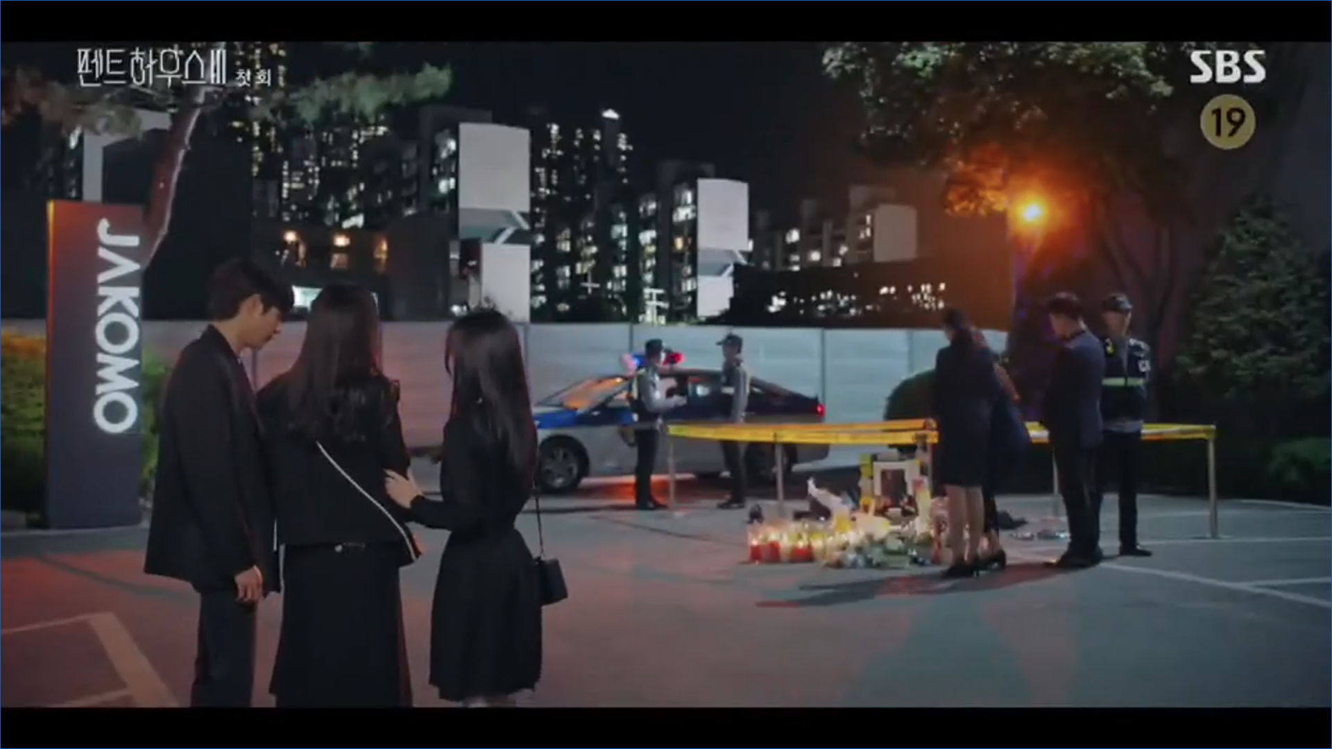 로건리가 사망한 현장 추모식에 참석한 심수련과 주석훈 그리고 배로나의 모습인데요, 뒷모습만 봐도 정말 슬퍼하고 있다는 느낌이 들어요. 이때 배로나의 오른쪽 어깨에 걸린 숄더백이 보이시나요?