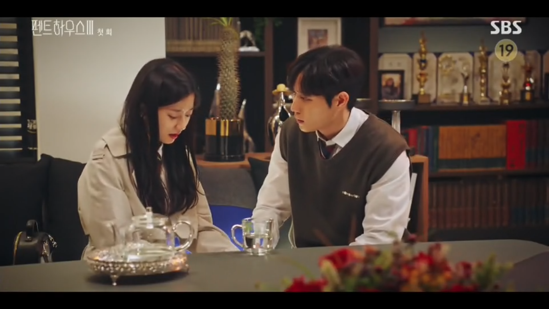 아빠인 주단태는 분명 교도소에 수감 중이었지만 갑자기 펜트하우스에 나타나 또 집안을 휘젓고 다니고 있어요. 아이들을 지키기 위해 주단태를 내쫓는 심수련의 모습.