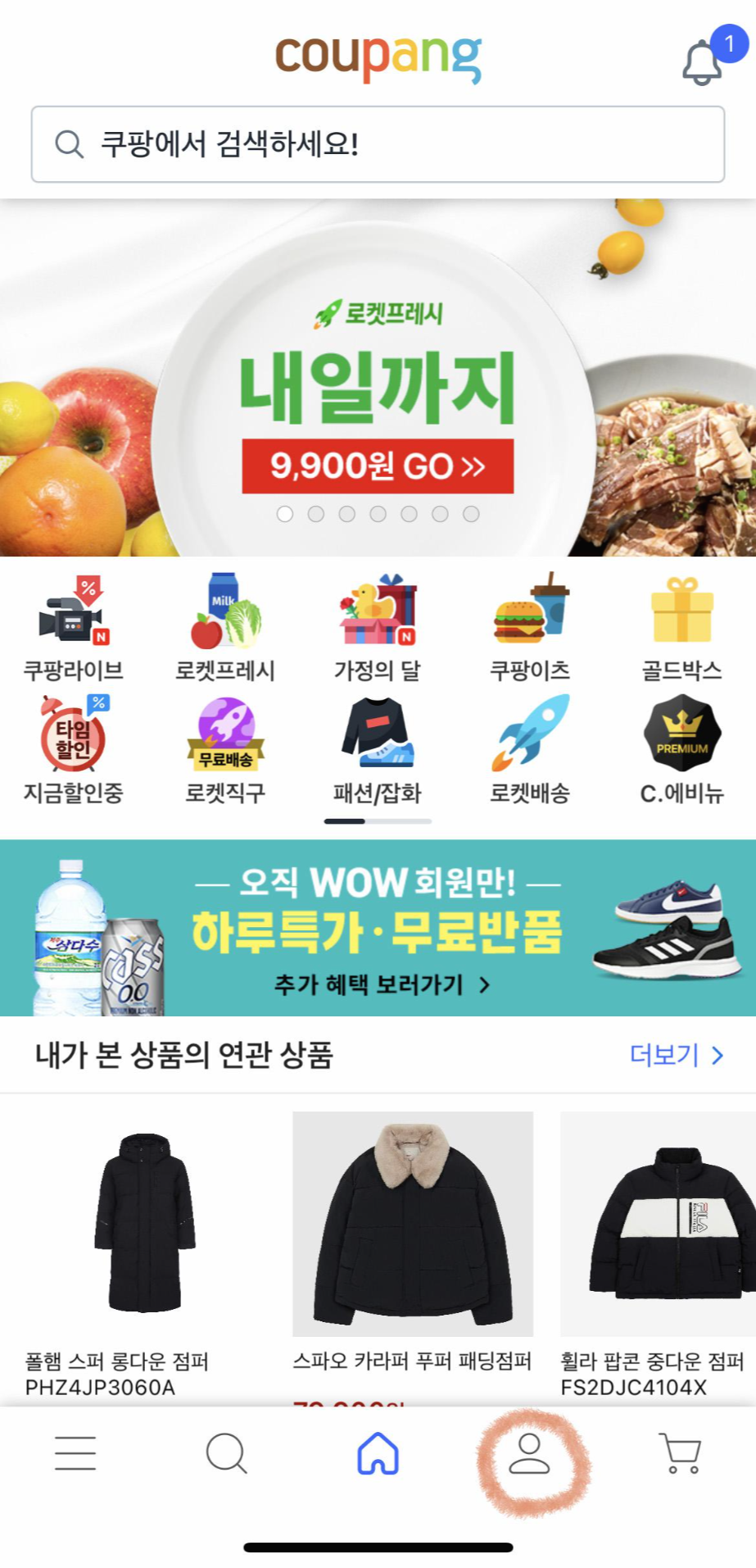 먼저 쿠팡 앱을 열어주세요. 그리고 하단 사람 모양의 마이페이지 아이콘을 클릭해주세요.