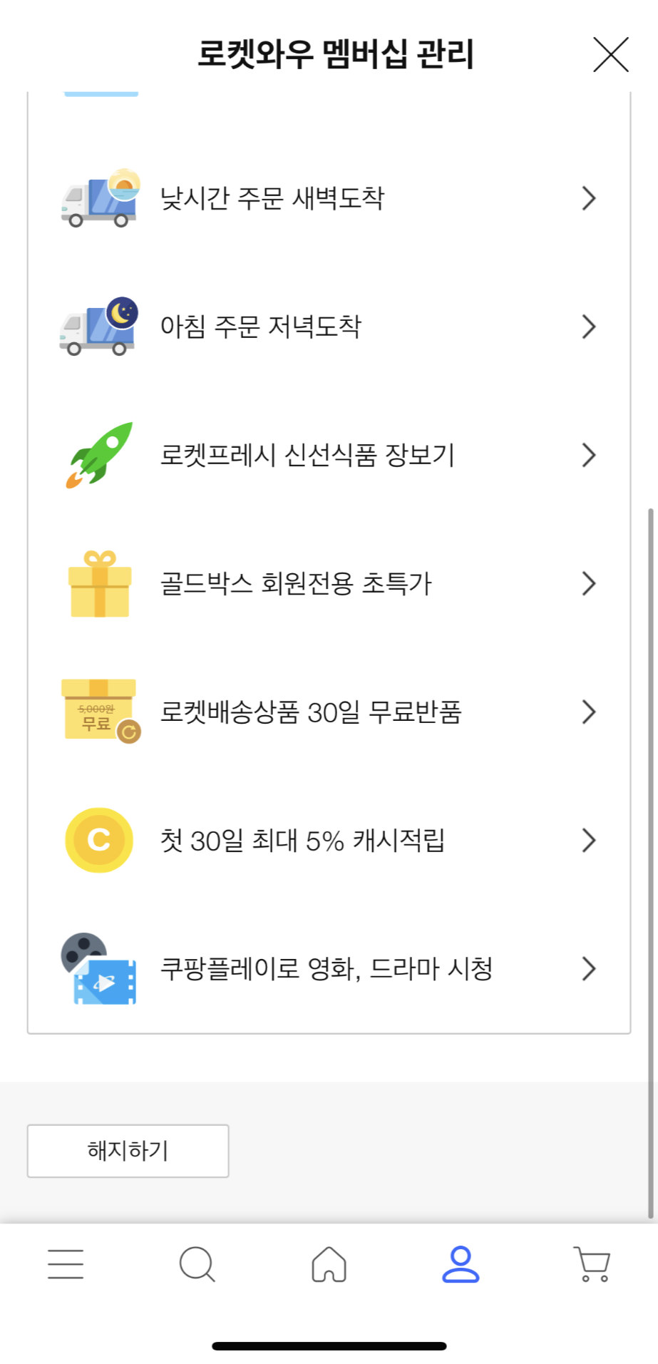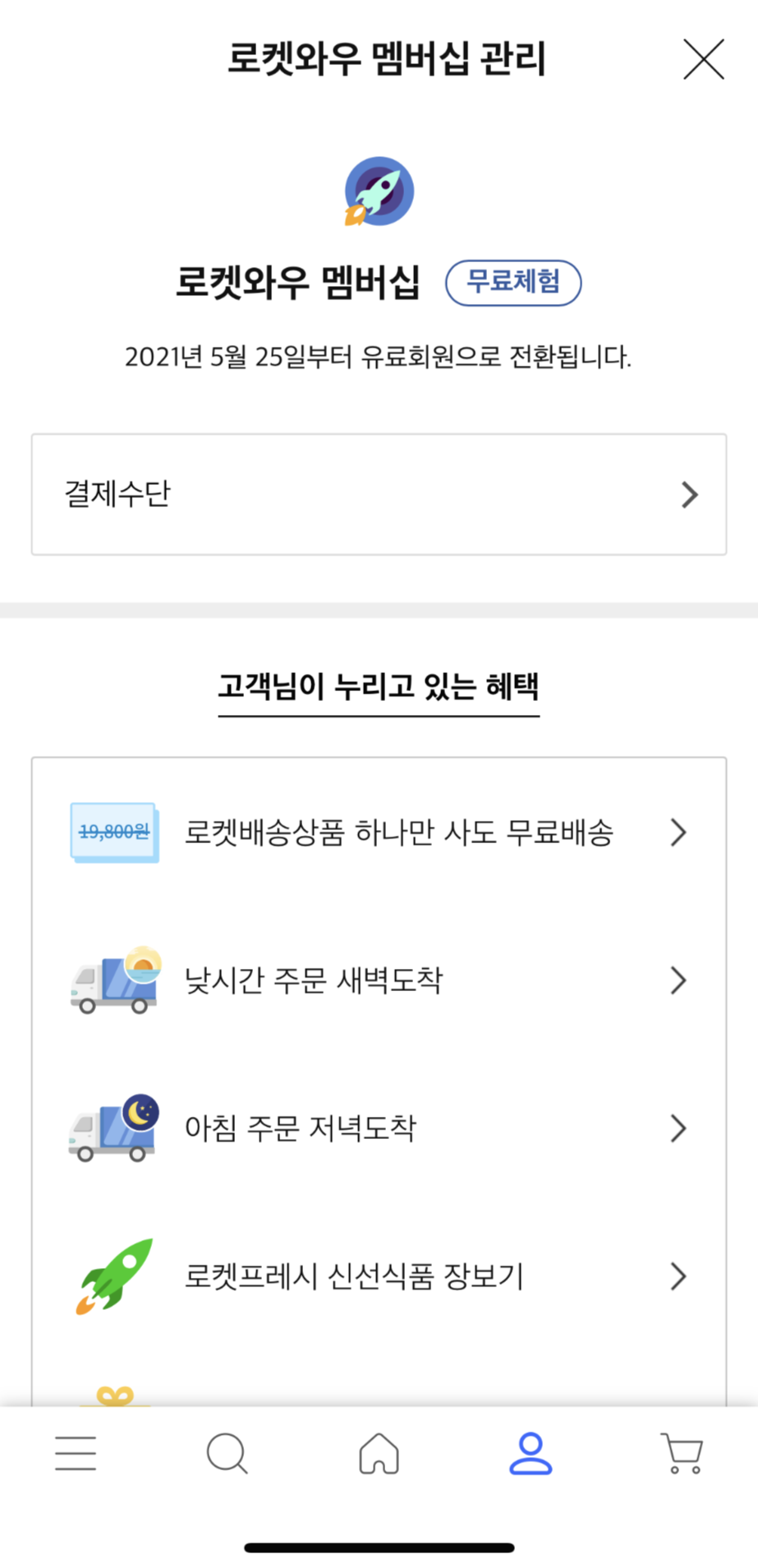 만약에 로켓와우에 가입이 된 상태라면 저처럼 'ㅇㅇ월 ㅇㅇ일부터 유료회원으로 전환됩니다'라는 문구가 뜨게 됩니다.