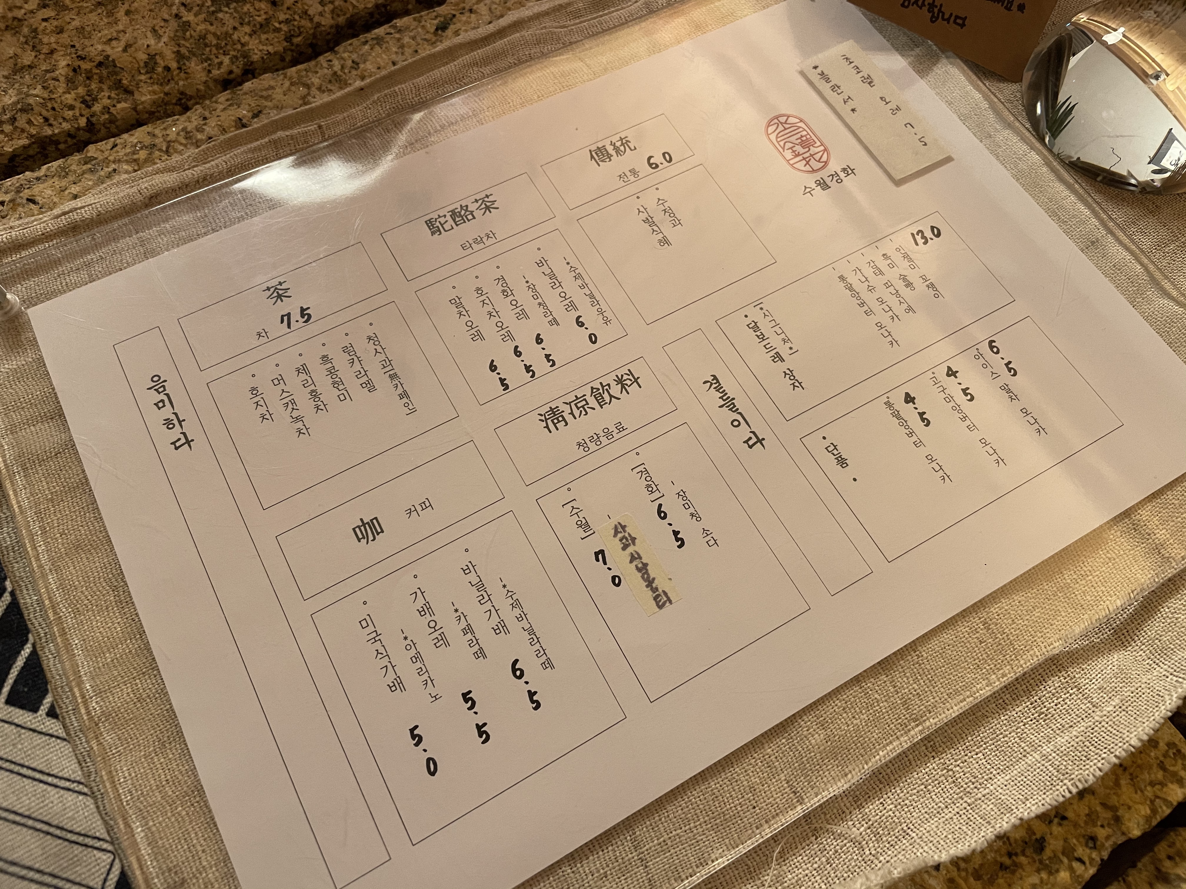 수월경화에서는 커피도 팔긴 하지만 차 종류가 메인인 곳이라 저희도 차를 시키기로 했어요.