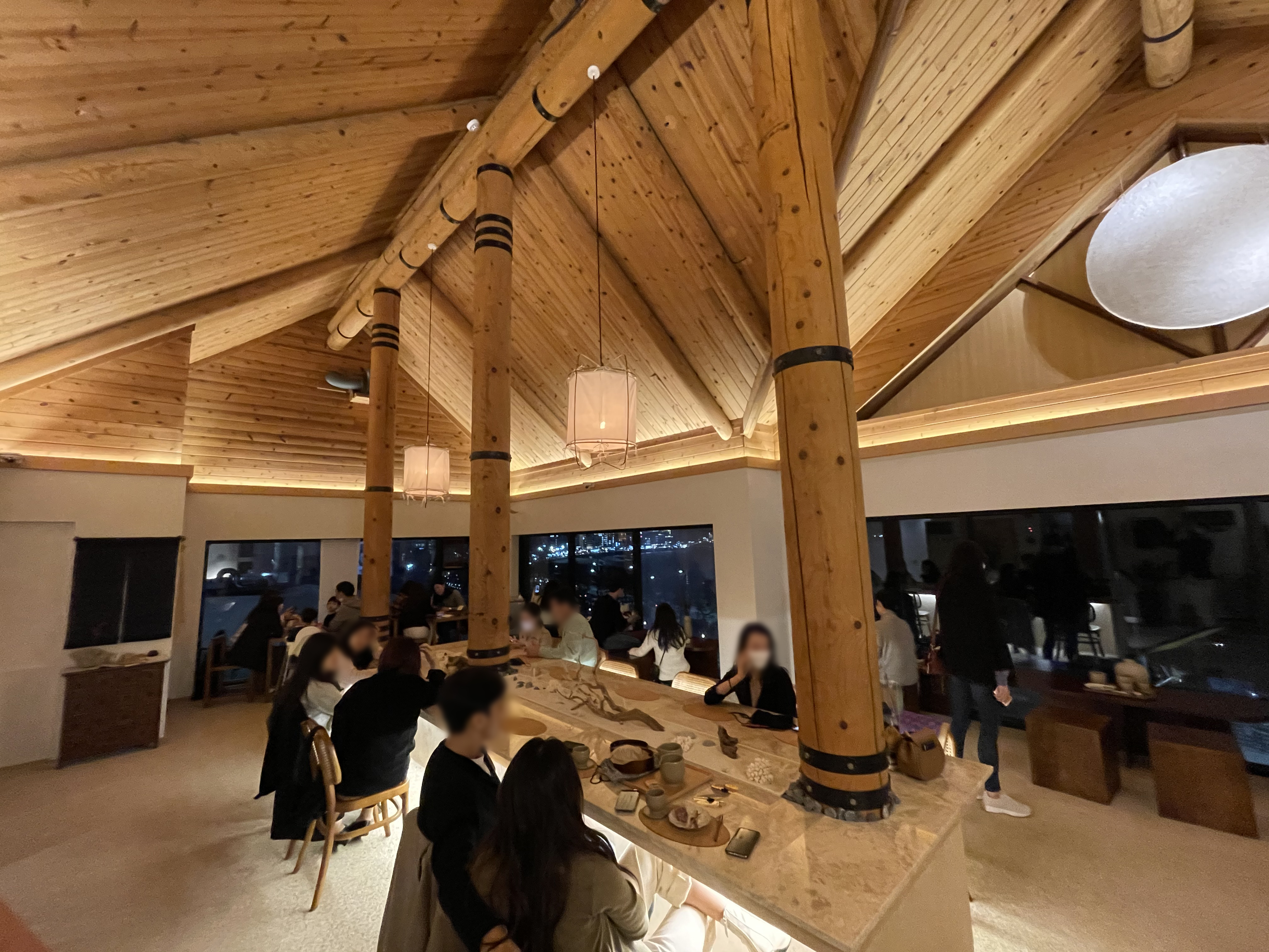 수월경화에서는 보통 낮에 오션뷰를 보기 위해 창자 자리가 더 인기가 많은데 밤에는 이렇게 중앙 바에도 사람들이 많이 앉더라고요.