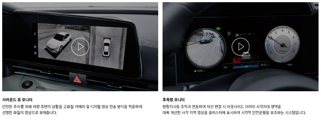또한 서라운드 뷰 모니터를 통해 안전하게 후면 주차를 할 수 있으며, 후측방 모니터로 방향지시등 조작과 차선 변경 시 아웃사이드 미러로 사각지대 영역을 확보해 안전운행을 보조해 줍니다.