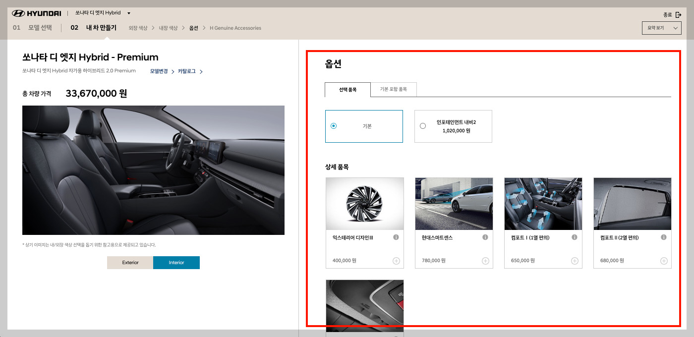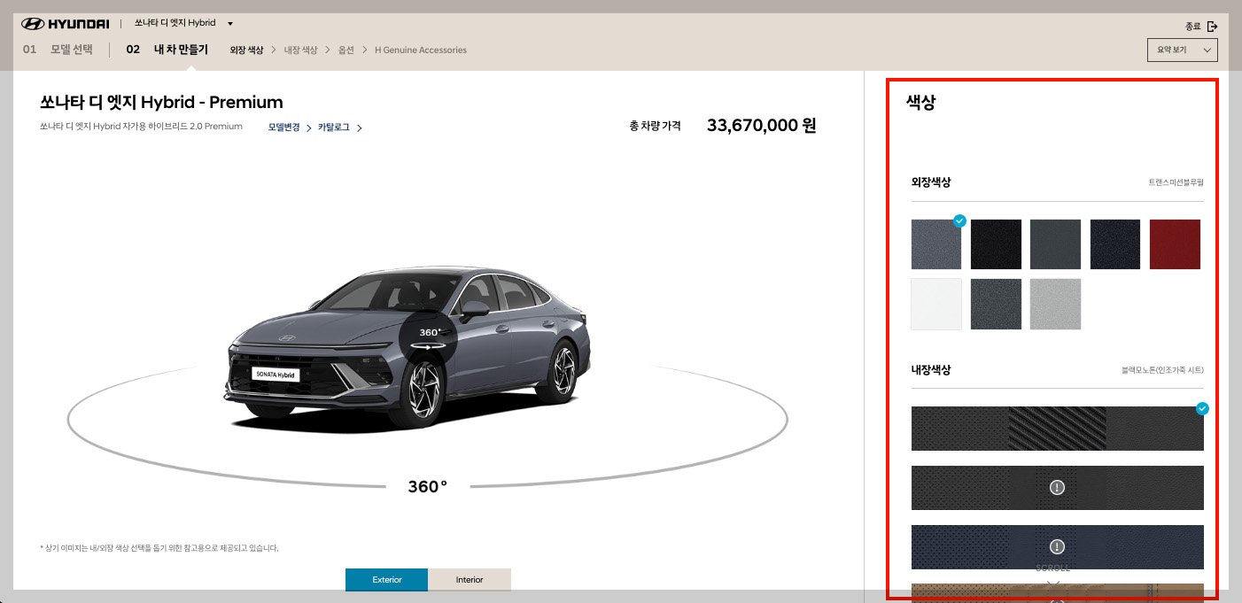 현대자동차 모의견적 서비스를 진행하는 과정은 꽤 간단한데요, 제일 처음 본인이 원하는 모델을 선택한 후 옵션을 차근차근 선택하면 모든 견적이 완료됩니다.