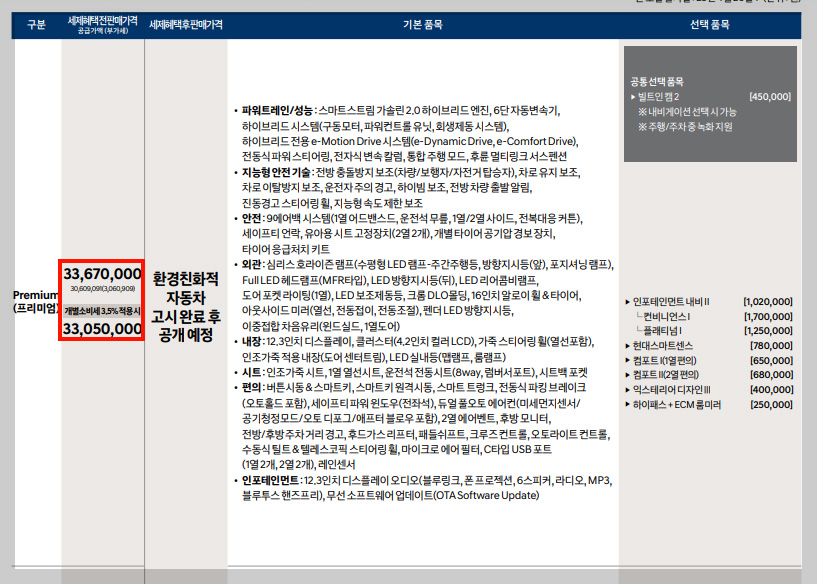 현대자동차 2024 쏘나타 하이브리드는 총 3가지 타입으로 프리미엄, 익스클루시브, 인스퍼레이션으로 나눠서 가격이 책정돼 있는데요, 타입 및 옵션에 따라 최저 3,300만 원에서 최대 4,100만 원대로 구입이 가능합니다.