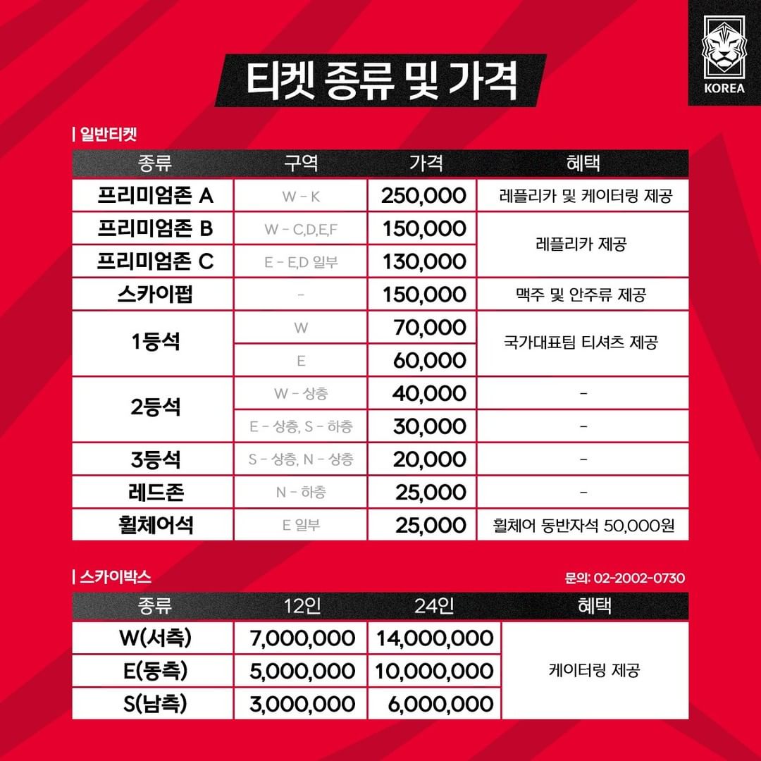 상암 월드컵 경기장의 입장권 가격은 좌석에 따라 상이한데요, 가장 저렴한 2만 원대의 3등석부터 축구 국가대표팀 유니폼이 제공되는 7만 원대의 1등석까지 그 외 유니폼과 식사까지 제공되는 25만 원대의 프리미엄석까지 존재합니다.
