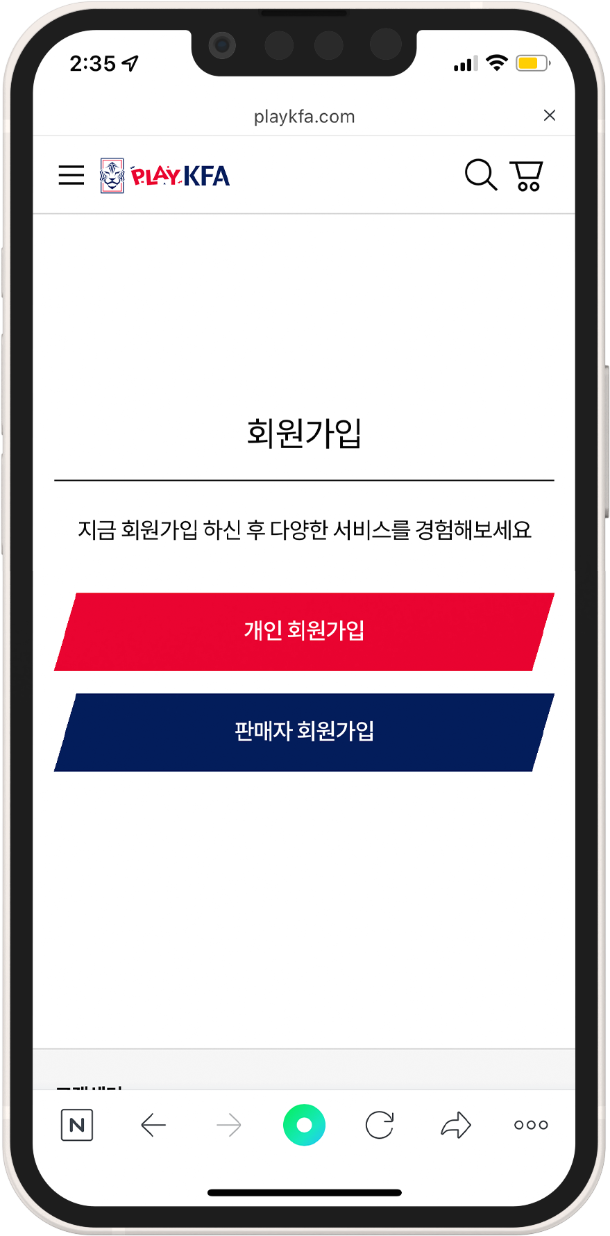 개인이 아닌 '판매자 회원가입'은 플레이KFA에서 축구 국가대표팀 굿즈 판매를 목적으로 입점하는 사람들을 위한 절차인데요, 현재 플레이KFA 샵에서는 대표팀 유니폼뿐만 아니라 특정 축구선수와 관련한 다양한 캐릭터, 소품 등의 굿즈를 판매하고 있어요.