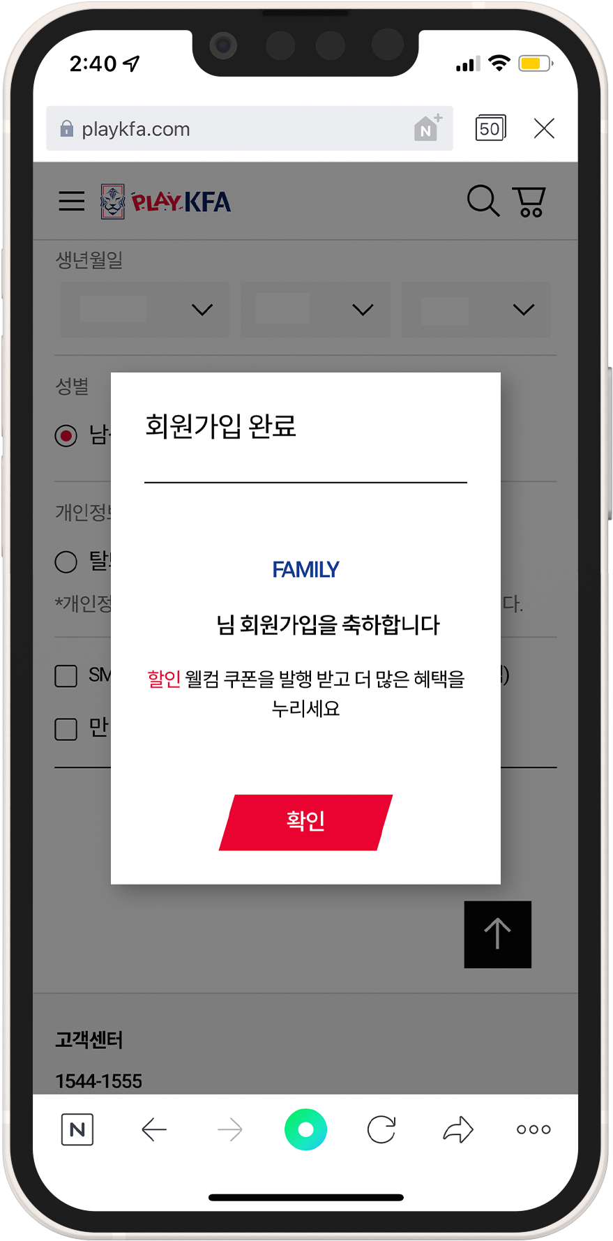개인정보까지 다 기입하면 이렇게 플레이KFA 회원가입이 완료됐다는 문자와 함께 웰컴 쿠폰이 발행되는데요, 이 쿠폰으로 좀 전에 말씀해드렸던 샵에서 다양한 굿즈를 구매할 수도 있습니다.